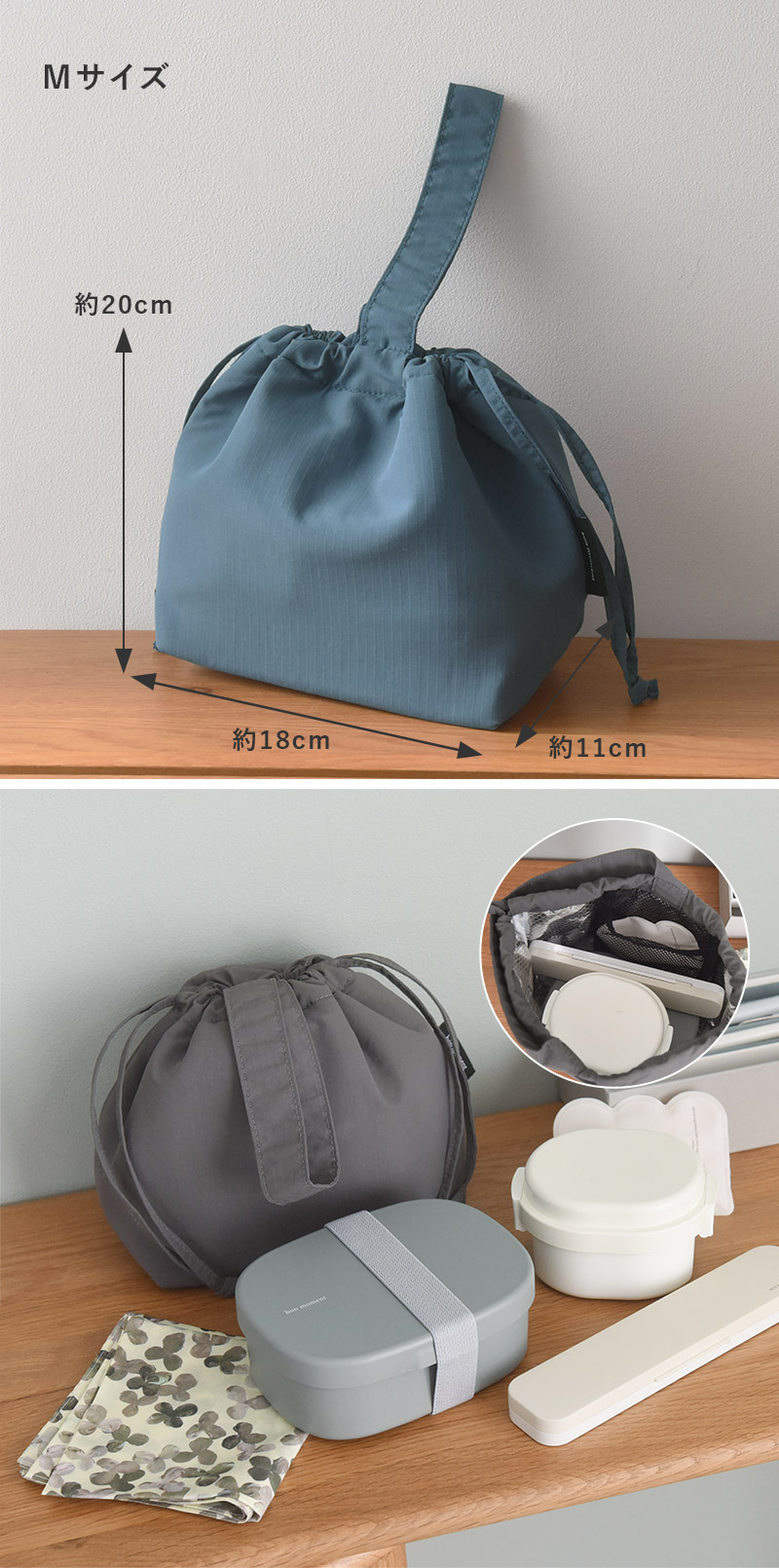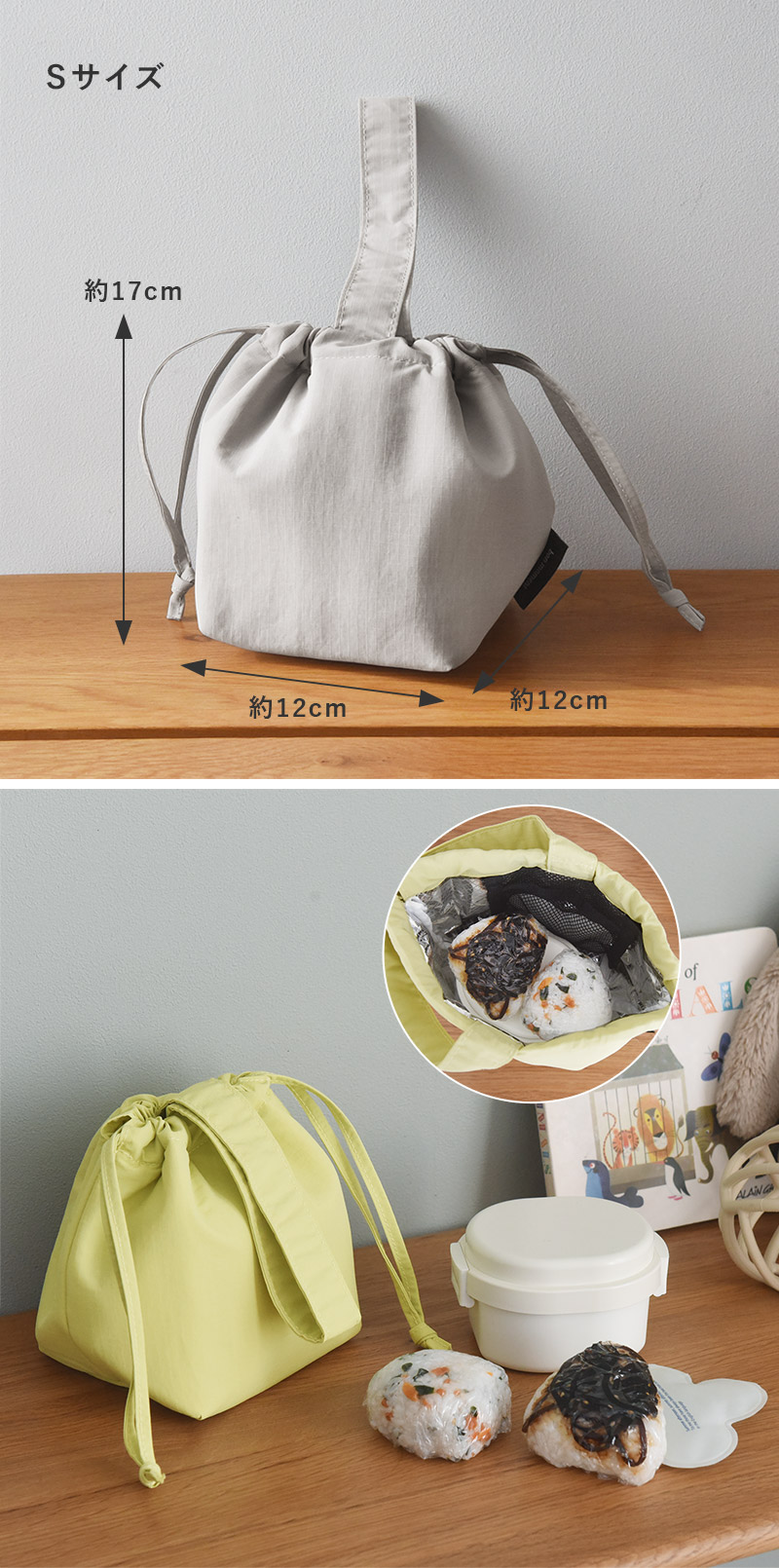 巾着型とワンハンドルの持ち手を合わせた保冷ランチバッグ。