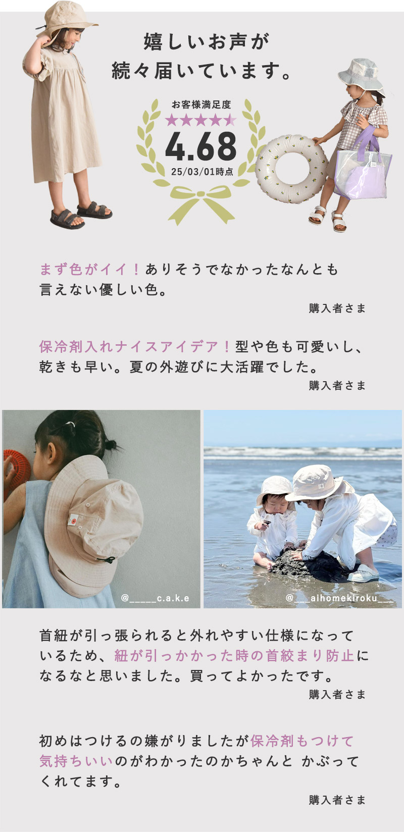 太い血管がある首を冷やすことで、体全体を効率よく冷やし、熱中症対策に効果的。頭の部分はメッシュ素材で熱がこもりにくく、あご紐付きだから元気に駆け回っても脱げにくいのが◎。炎天下でも遊びたい盛りの子どもたちに、サッと被せてあげたいお守りハットです。
