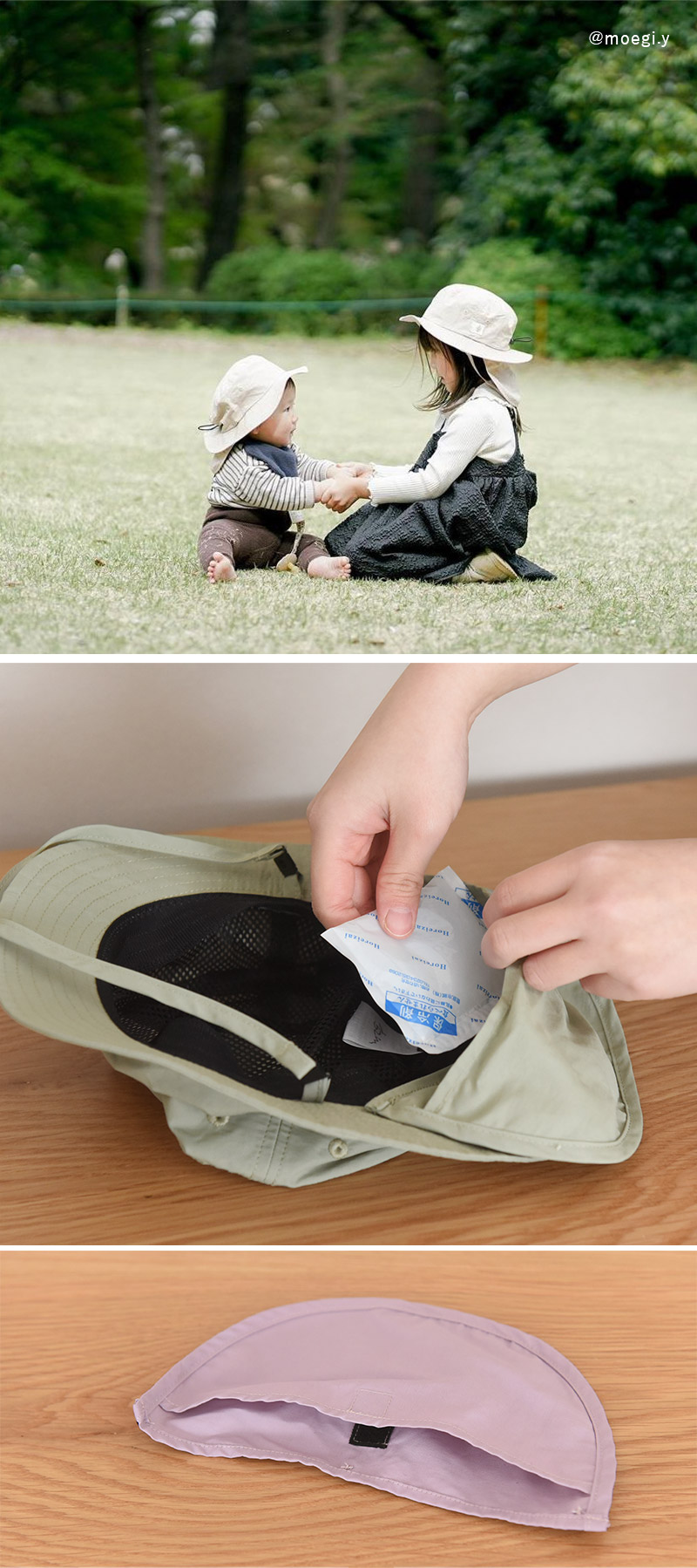 日よけタレと保冷剤ポケットが一体化。開け閉めしやすい面テープ仕様のポケットで、スムーズに保冷剤を入れられます。
