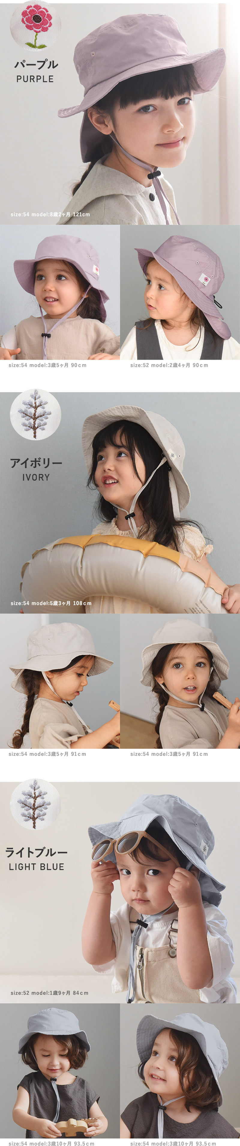 あご紐でしっかり固定も取り外しも可能なあご紐付き。しっかり固定しておけば、駆け回ってハットが脱げたり、風で飛んでしまう心配もなし。前に垂らすと邪魔になってしまう場合は、後ろに垂らして被ることもできます。