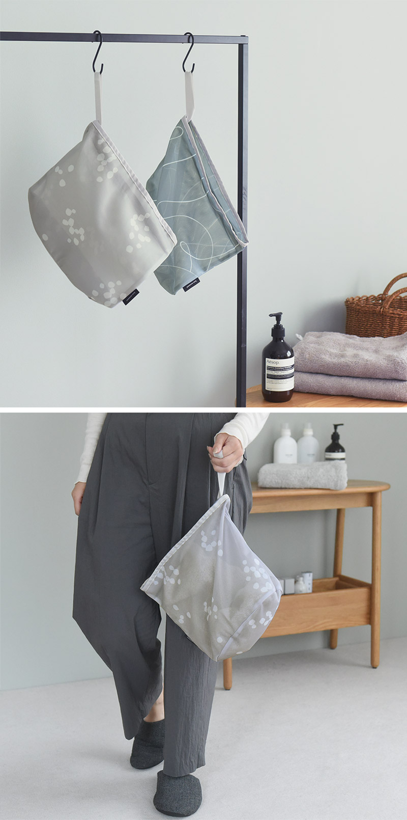- 見せ置きできる洗濯ネット。人に見られてもOKなデザインなので、旅行の着替えを入れて持ち歩いたりと用途の幅が広がります。分けて洗える仕切り付きも仲間入りしました。