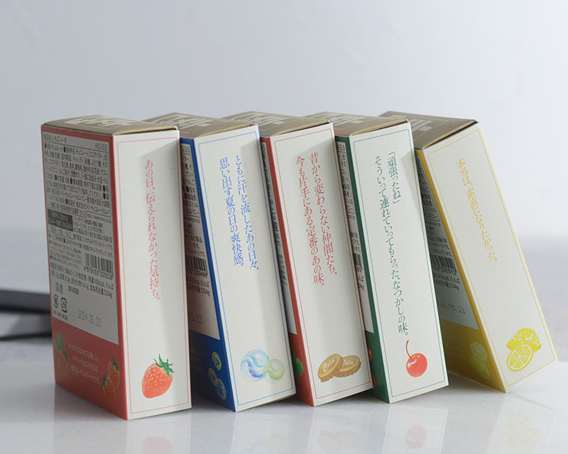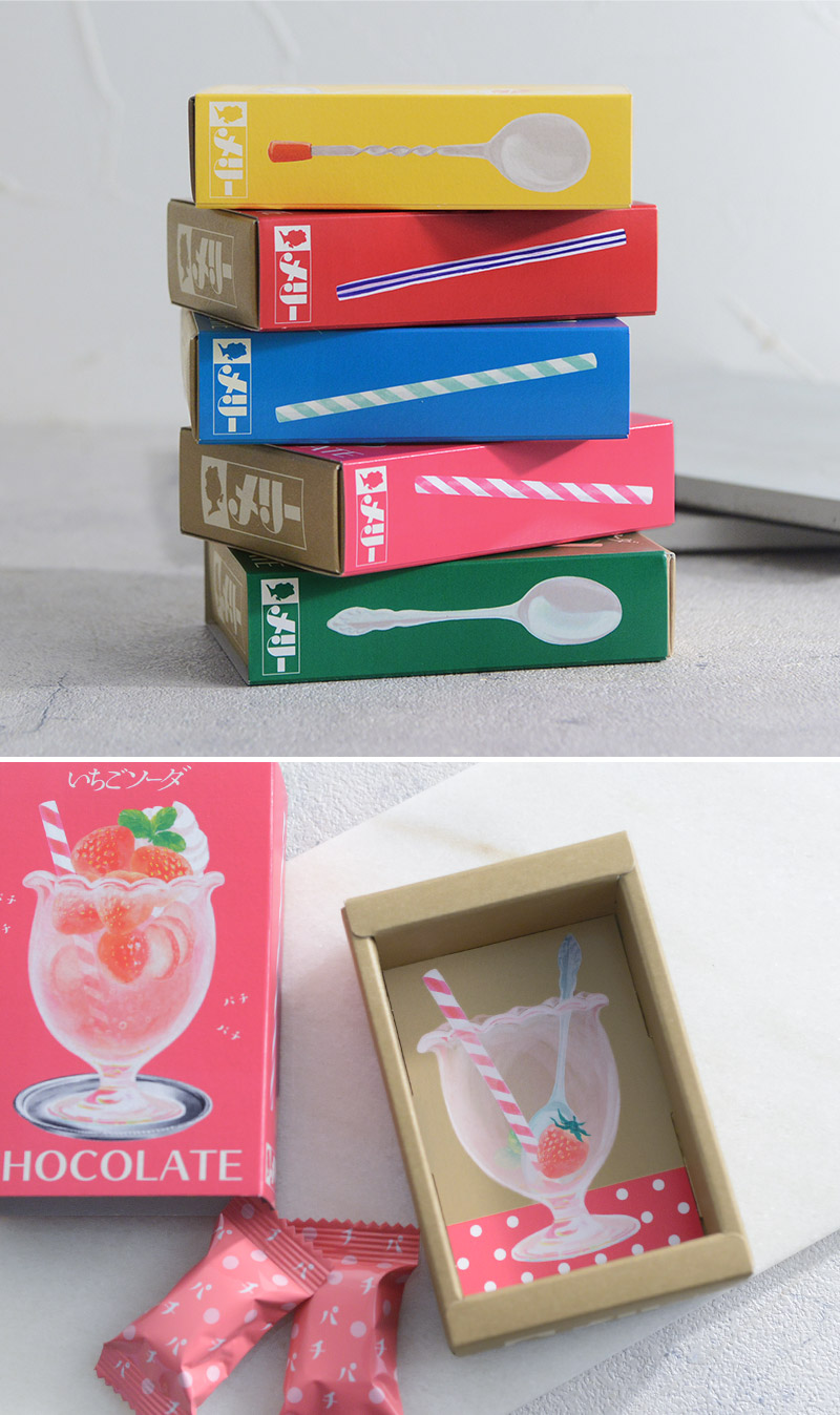 レトロ文具を手掛ける古川紙工とのコラボパッケージ。表面には、純喫茶で見かけるような定番のドリンクがずらりと並びます。マッチ箱を連想させるスライド方式の箱とイラストが相まって、どこか懐かしさを感じます。