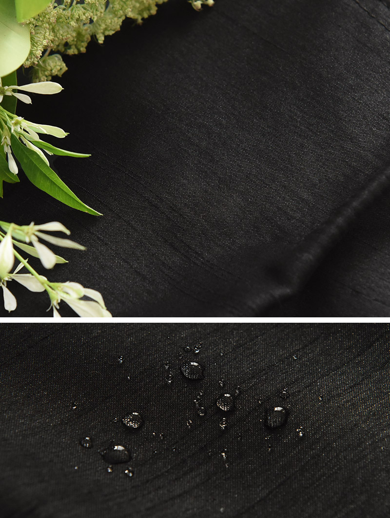 ややハリ感と、微光沢のあるシャンタン風の素材。生地表面には撥水加工が施してあるので、少しの水なら跳ねてもOK。濡れた場合は直ちに拭き取ると、鞄の中まで染み込むのを防げます。