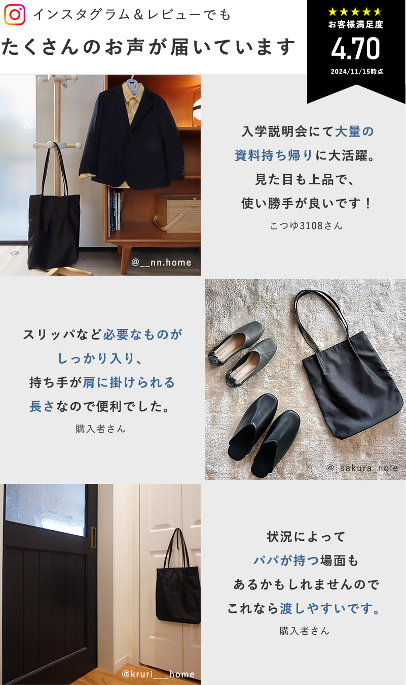 入園・入学式当日は、室内履きや書類、ビデオカメラなど、持ち歩く荷物は意外と多いもの。直前になって「バッグに入り切らない!」と焦らないためにも、サブバッグを持っておくと安心です。
