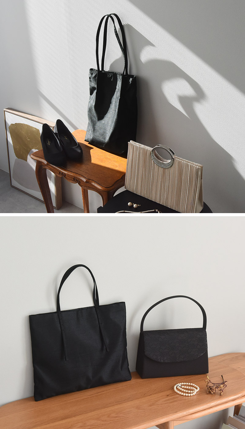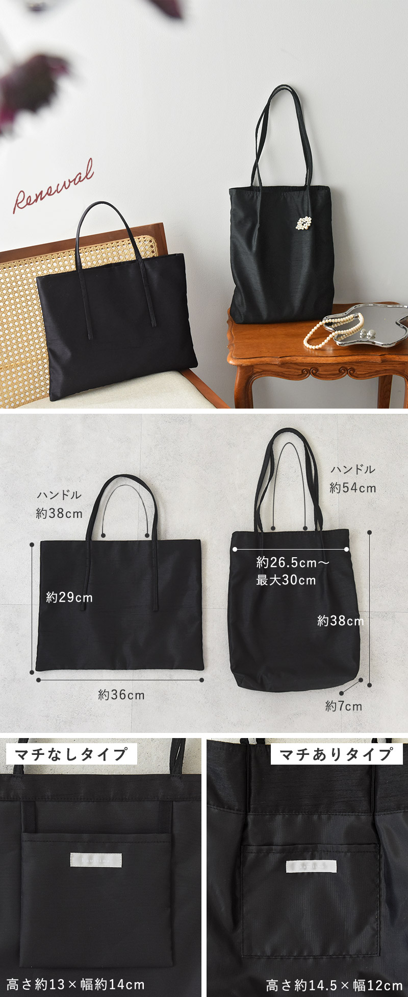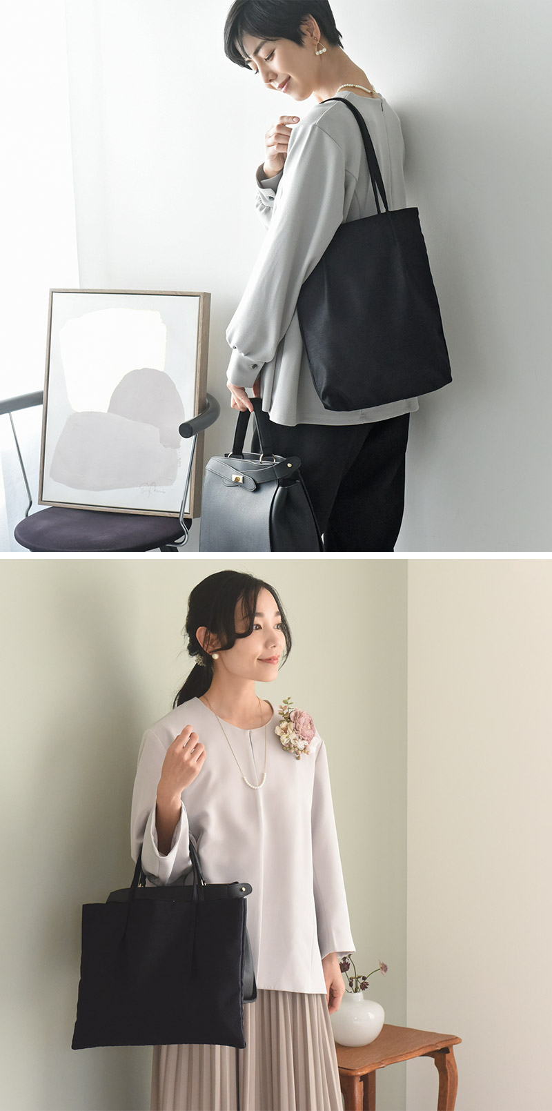 マチありブラック×マチあり。見た目の上品さと収納力を兼ね備えたバックは、フォーマルシーンだけでなくデイリーにもお使いいただけます。