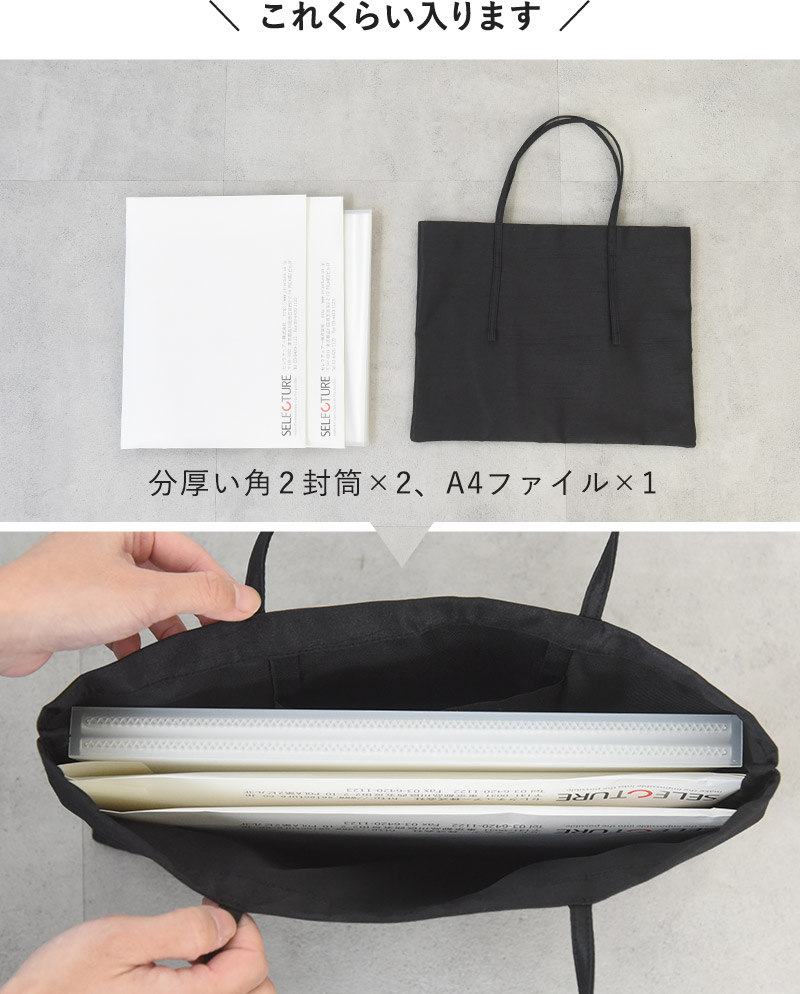 A4サイズの資料を入れた角2封筒がすっぽり収まる、使いやすいサイズ感。荷物がしっかり入るマチありタイプと、2025年から横型にリニューアルして中身が見やすくなったマチなしタイプの、2タイプをご用意しました。