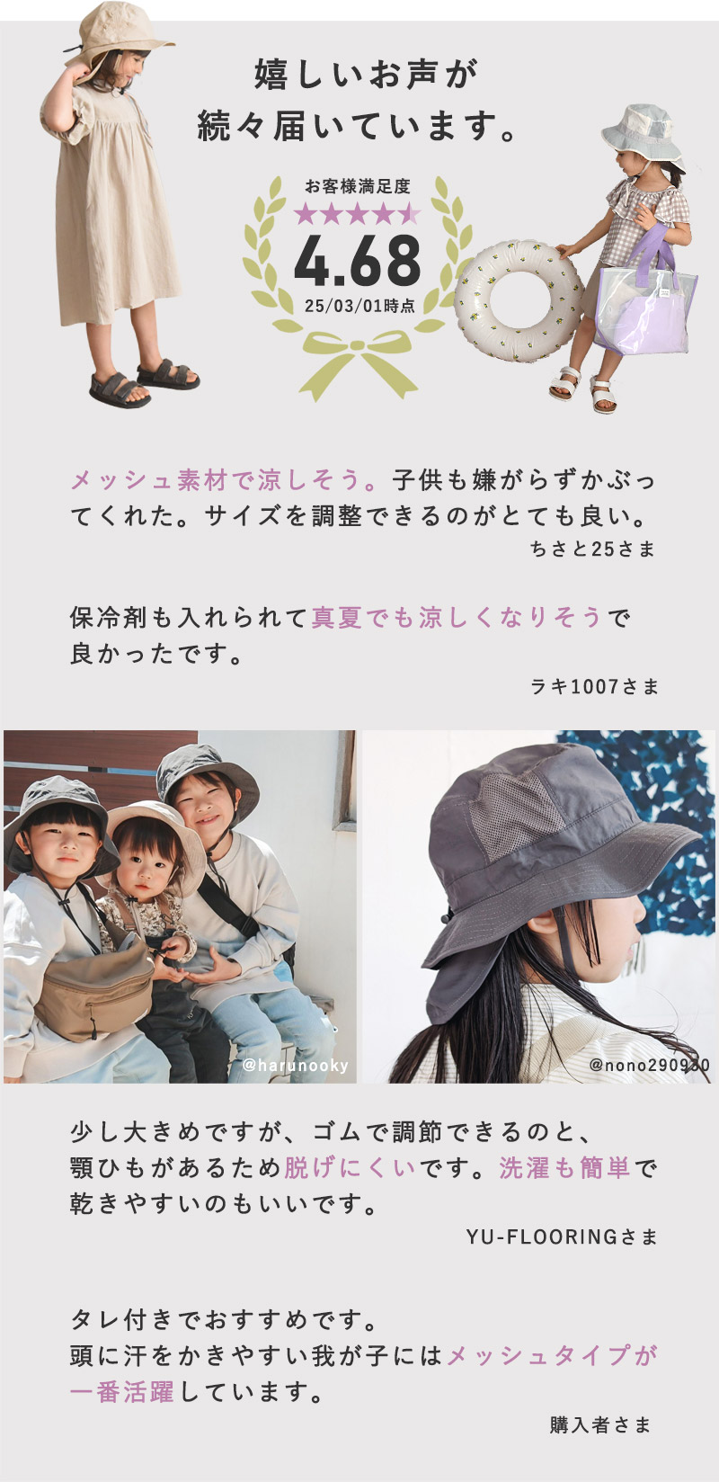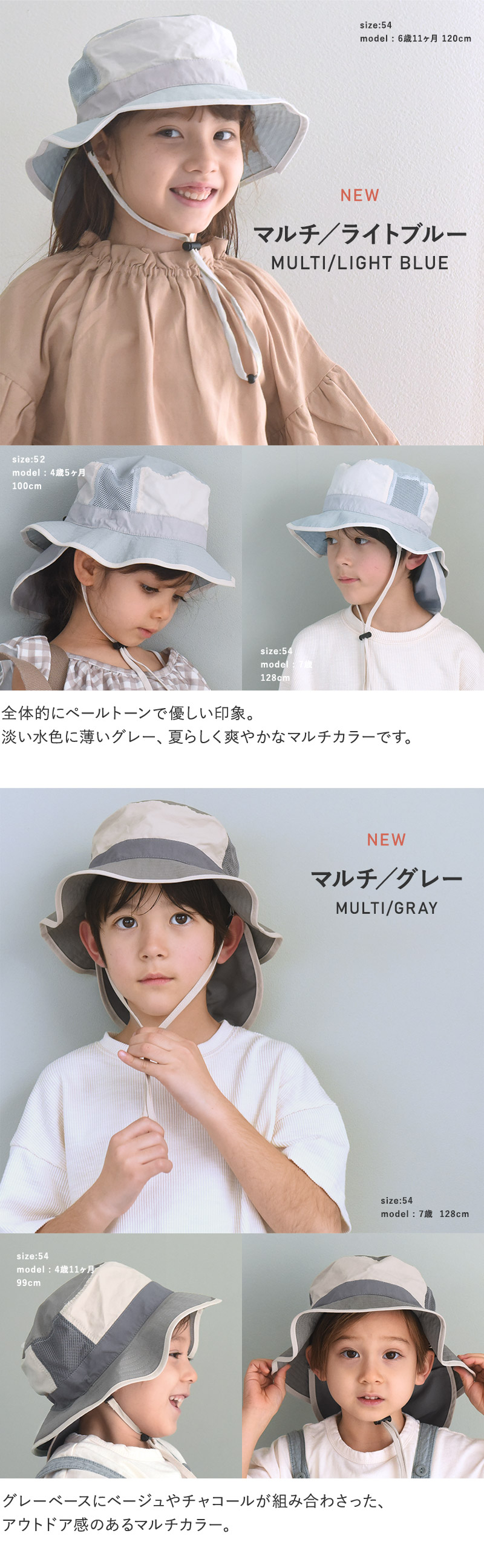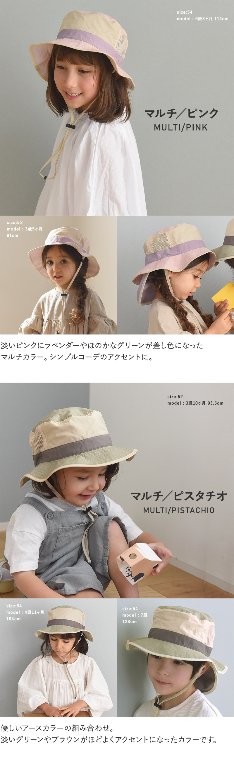 メッシュ素材で通気性アップ&乾きも早い通気性を高めるために、ハットの一部がメッシュ素材になっています。裏地を合わせない1枚仕様なので、汗をたくさんかいても頭が蒸れにくいのもポイント。また、水に濡れても乾きが早く、夏の水遊びシーンでも活躍。お庭や公園で水遊びをしたり、プールや海・川遊びなど夏のレジャーにもぴったりです。