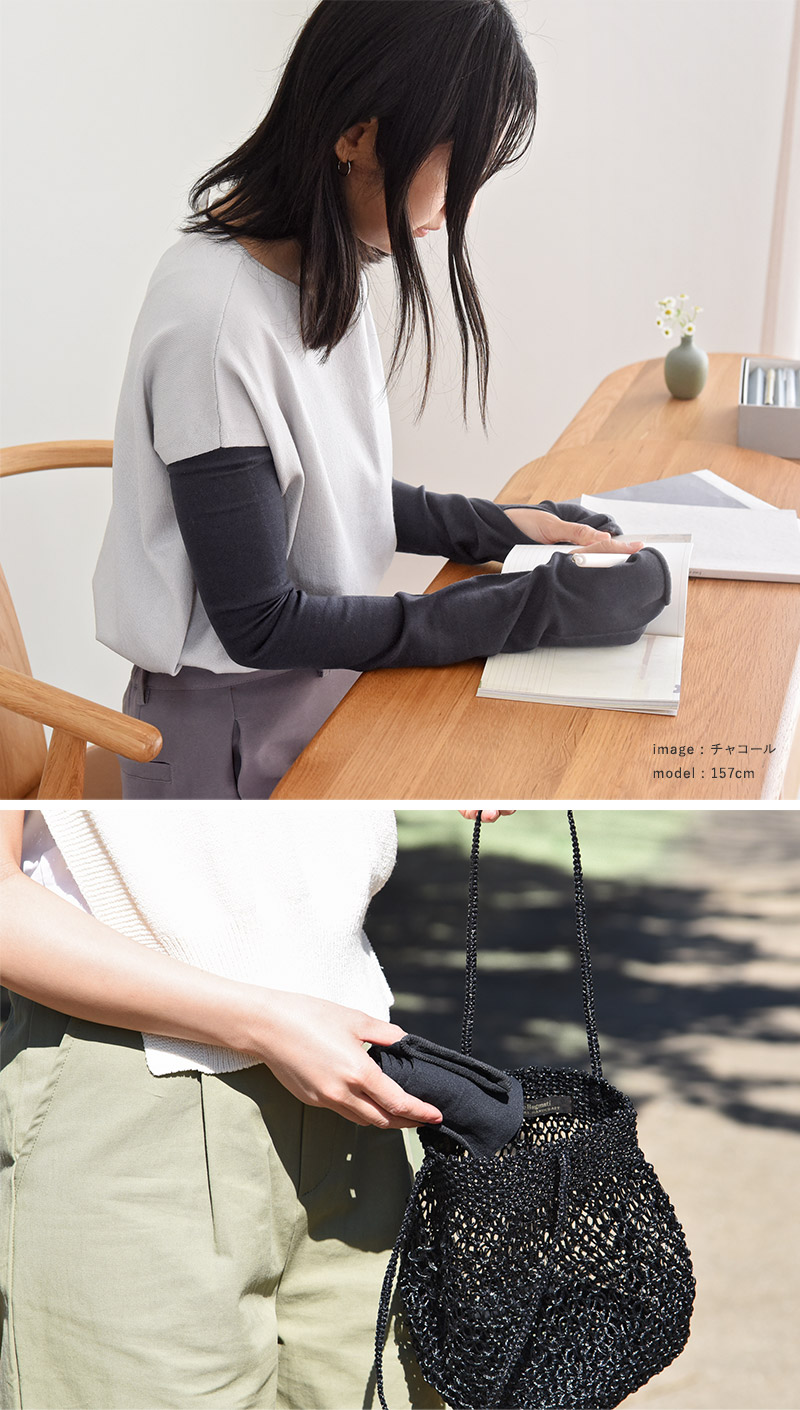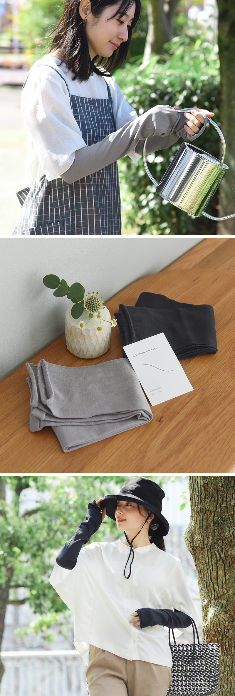 車や自転車の運転中など、日傘を差せない場面で活躍するアームカバー。今年から素材をリニューアルしたこちらは、“天然のエアコン”とも呼ばれるシルクを内側に使用した、素肌に優しいアイテムです。