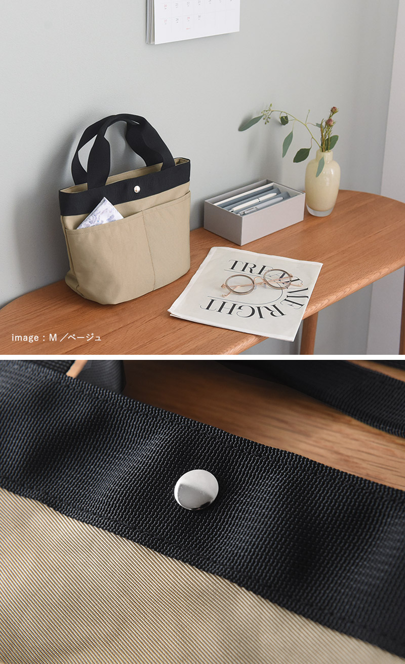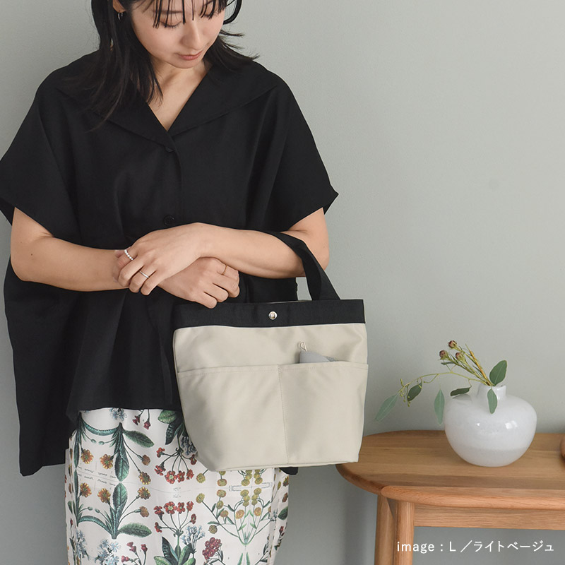 ハリがあり少し光沢感のある生地に、ぐるりと巡らせたブラックのテープハンドルで、アパレルライクな見た目に。