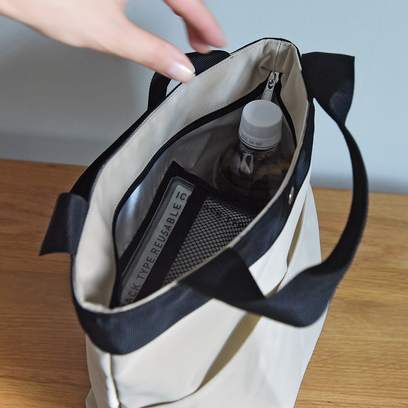 外側にはオープンポケットが付いています。メインバッグが荷物を出し入れしにくいリュックの時も、ランチトートを持っていれば、スマホやパスケースを手元にキープできて便利。