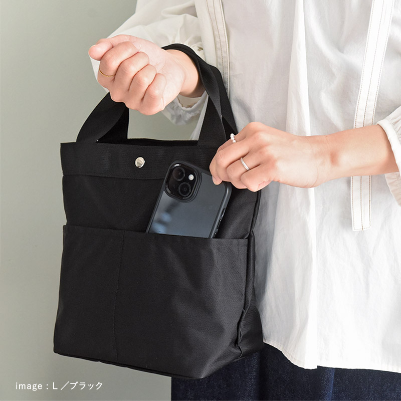 外側のポケットには、通勤中にサッと出し入れしたいスマホやパスケースも入れられる、ちょっと嬉しいランチバッグです。