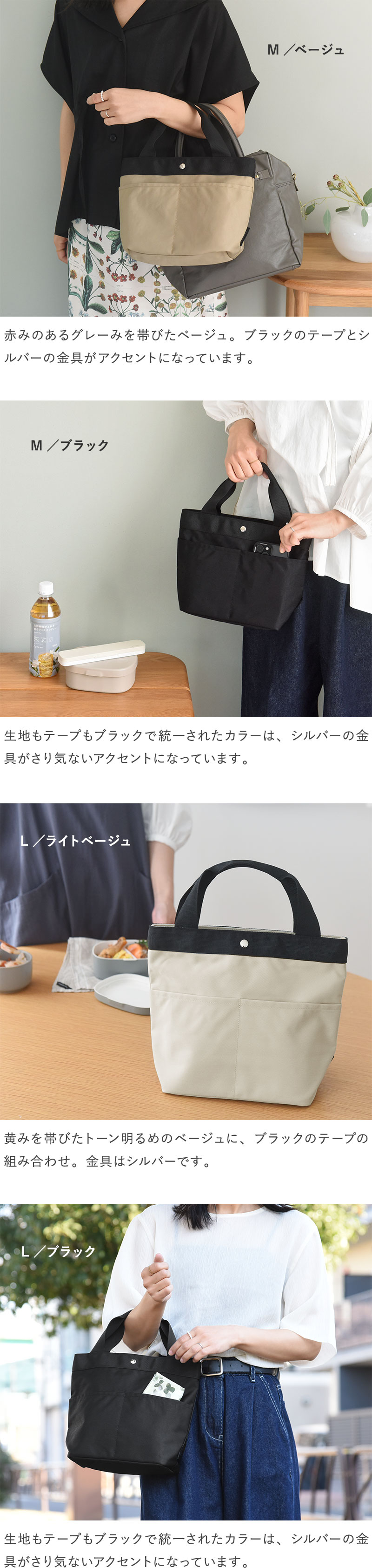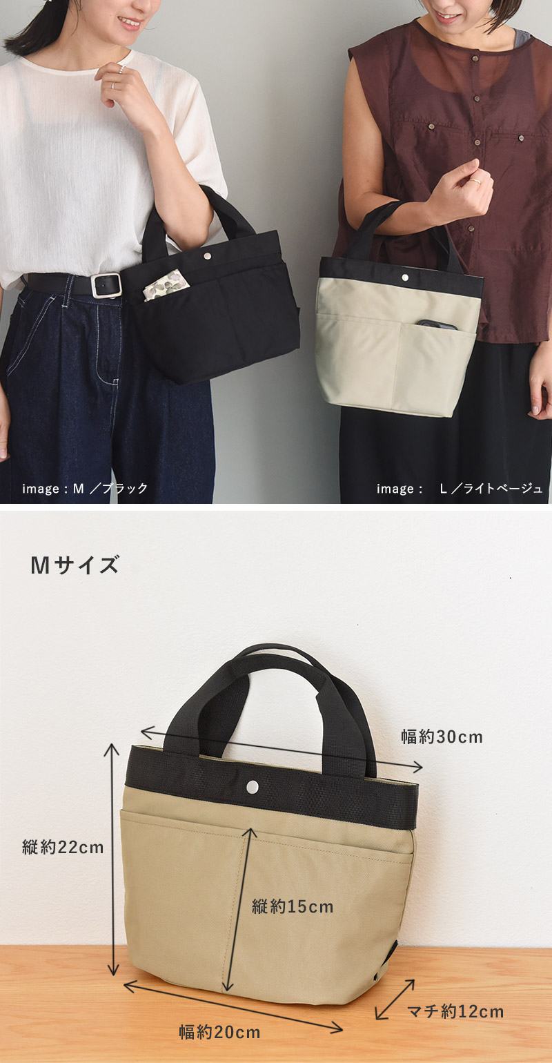 • Lサイズを購入。暑い日が続くので、コンビニで冷たい飲み物を購入して持ち歩くのにも丁度良い大きさでした。内側にもう一つポケットがあると小銭入れと買った物がバッグの中でくっつかなくて良いのにと思いました。