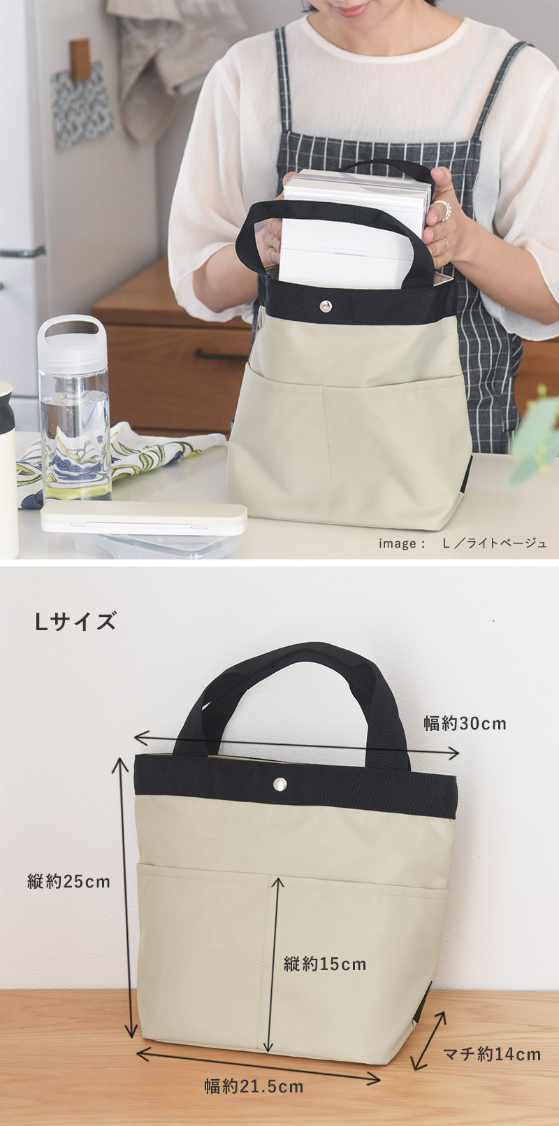 Lサイズは、男性用の大きなお弁当箱と、水筒も一緒に入るサイズ感。ピクニックなどで家族分のランチを持ち歩く日にも活躍します。