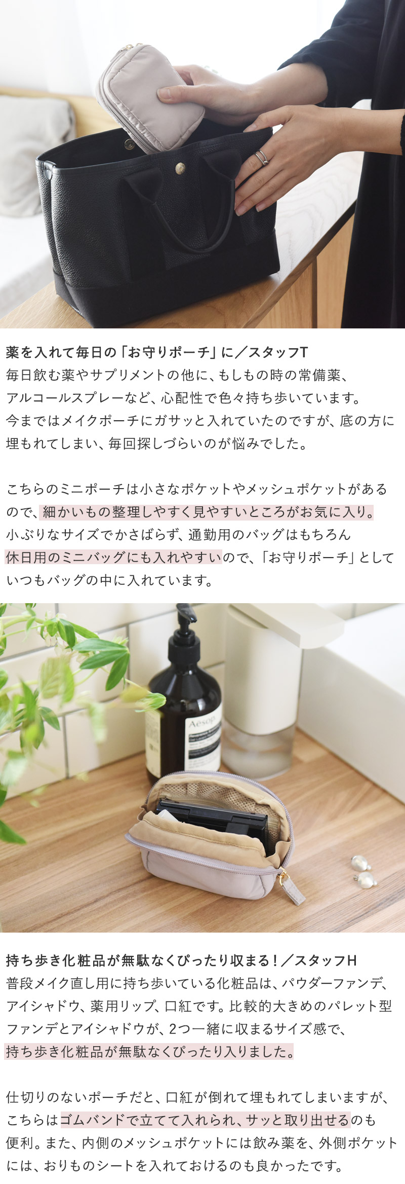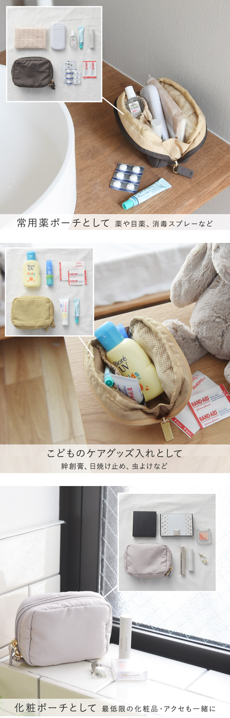 コンパクトだからこそ、効率的に収納ができるよう、とことん追求したデザイン。外出先でのお化粧直し用ポーチとしてや、常用薬ポーチ、絆創膏など子供のケアグッズの収納ポーチとしてなど、マルチな使い方を叶えてくれます。