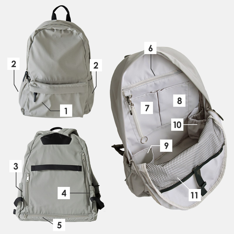 両手が空いて、身体への負担感も少ないリュック。一見シンプルなこちらのリュックは、なんと11個ものポケットが付いている超機能派なんです。背負ったままリュックを下ろせる、バックル付きのショルダーベルトや、防水ポケットなど、あったらいいなと思う機能が網羅されています。