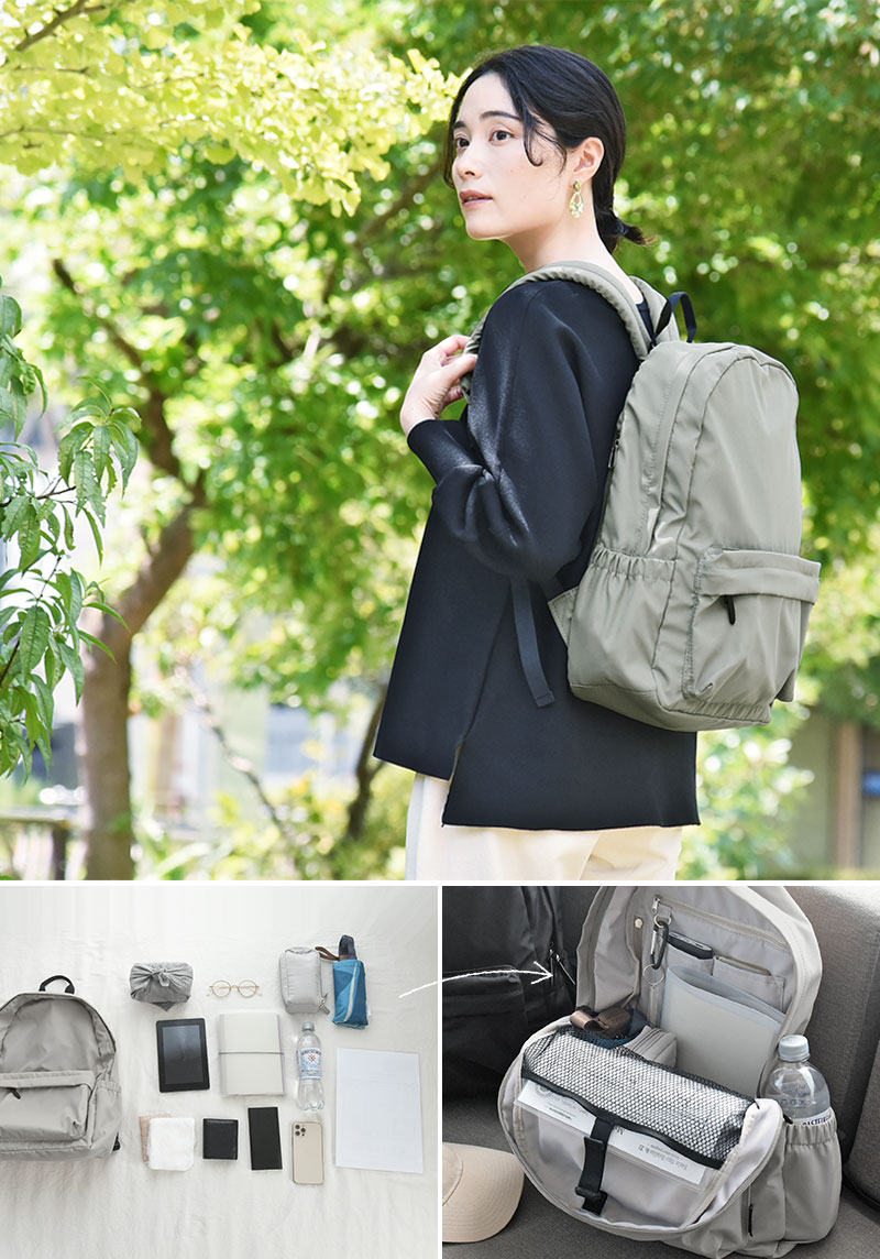 A4サイズのファイルや13.3インチのノートPCもケースごと入る、たっぷりの容量。ポケットが11個もあるので、荷物がごちゃつかず、必要な物をサッと取り出せます。他にも、大きく開くダブルジップや、荷物を見つけやすいライトグレーの裏地など、使いやすさの工夫が目白押しです。