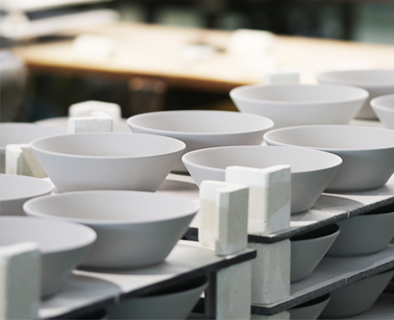 製品の1点1点が、人の手と機械による製造工程を経て作られます。成形ののち乾燥、そして24時間の素焼き。一般的な窯元の温度よりも高い1300℃以上の高温で焼成することで、耐久性に優れた製品ができます。通常よりも完成に時間はかかるけれど、製品を長く使って欲しいから・・・そんな職人さんの思いが込められています。