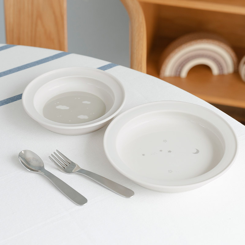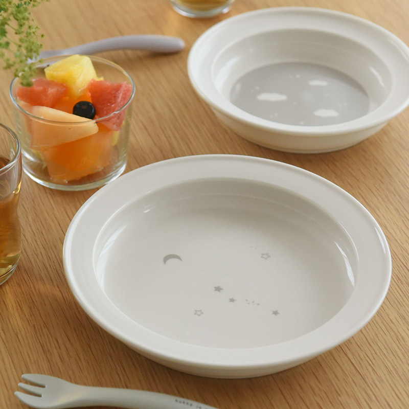すくいやすいうつわは、乗せる料理や子どもの年齢に合わせて2サイズからお選びいただけます。16.5cm(内径12.5cm)は、夜空に浮かぶ大小の星々が描かれたデザイン、19cm(内径15.6cm)は少し大人らしさのある、流れ星のデザインです。