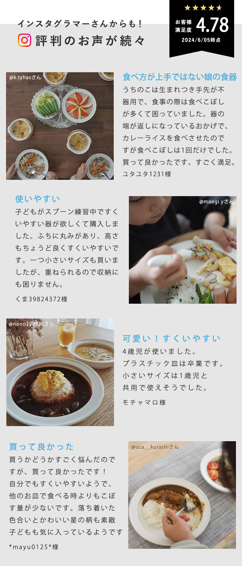 • 今まで離乳食食器で小さいプラのもので揃えていましたが、1歳半になり新調。自分ですくいやすいので、イライラせずに食べれてそうです!