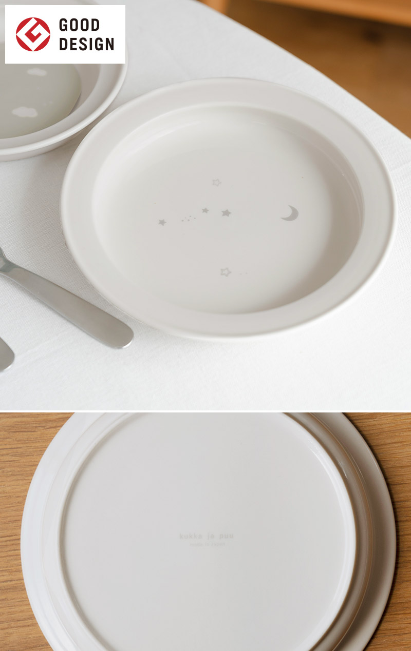 こちらは2002年にグッドデザイン賞を受賞した、陶磁器デザイナー森正洋さんのユニバーサルプレートに、kukka ja puu(クッカヤプー)オリジナルのイラストをプリントしたもの。赤ちゃんから手の力が弱い方まで、どんな方にも使いやすい工夫がされています。