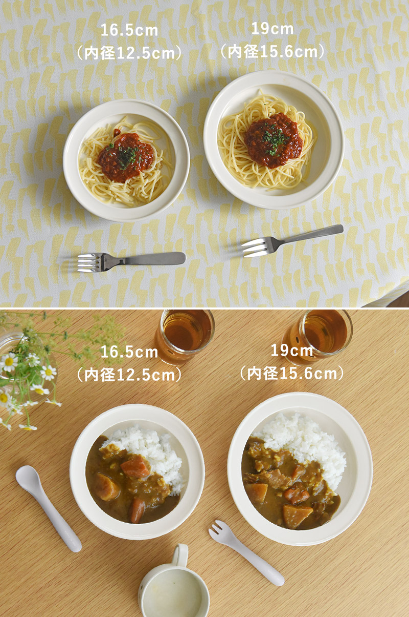 こちらは内径15.6cmの大きめサイズ。スプーン食べ練習時期なら副菜も乗せてワンプレートに、小学生でも主菜を乗せるのにちょうど良く、長年愛用していただけます。