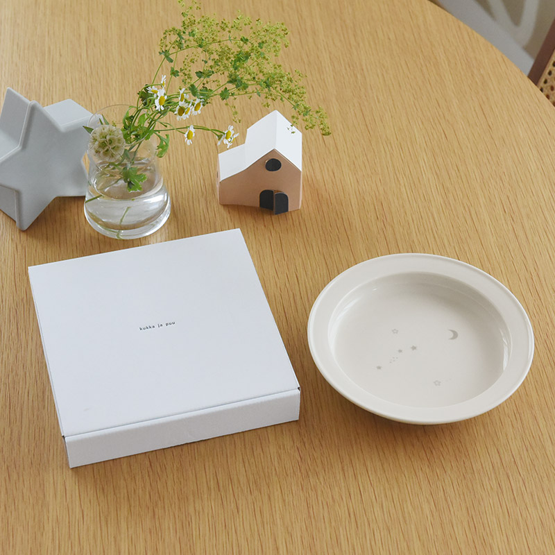 うつわはkukka ja puu(クッカヤプー)のロゴ入りの箱でお届けします。盛り付ける料理を変えて長く使えるうつわなので、出産祝いやお誕生日祝いのプレゼントにもぴったりです。。