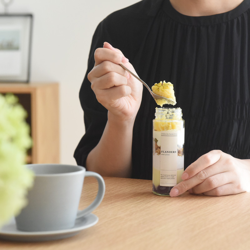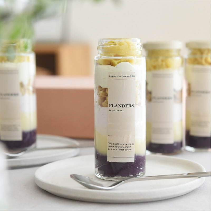 お芋スイーツ専門店「Flanders Frites」の瓶パフェは、瓶の中にスイートポテトパフェを閉じ込めた新感覚スイーツ。1つの瓶でさつまいものすべてを楽しめます。