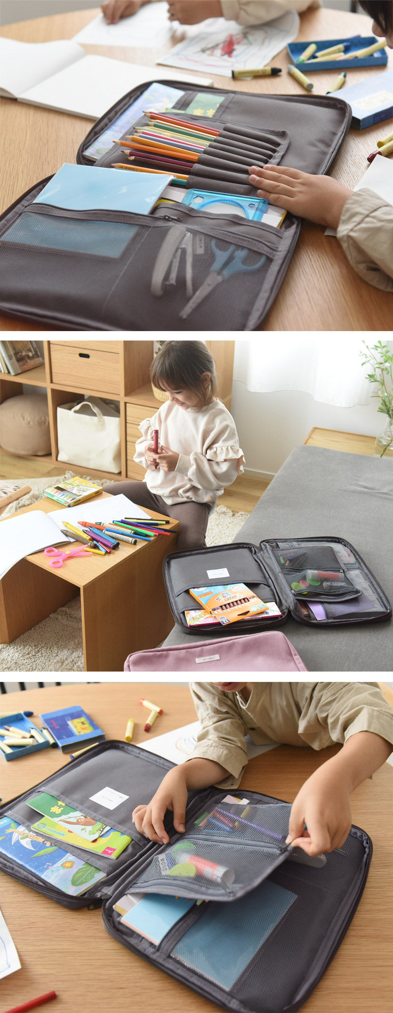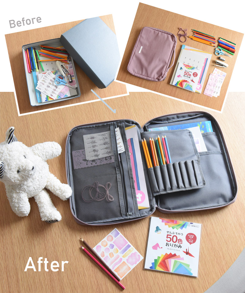 お絵かきグッズ、工作グッズ、レターセットやシールの他に、宿題や勉強グッズまで入れられるから、帰省先や旅行先のお供にもぴったりです。