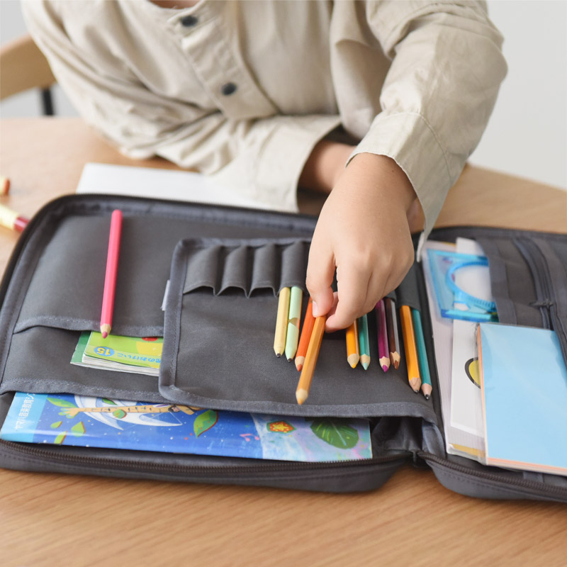 中には8本分のペン入れと7個のポケットがあり、充実の収納力。物の定位置が決まるのでお片付け習慣も身につきそうです。