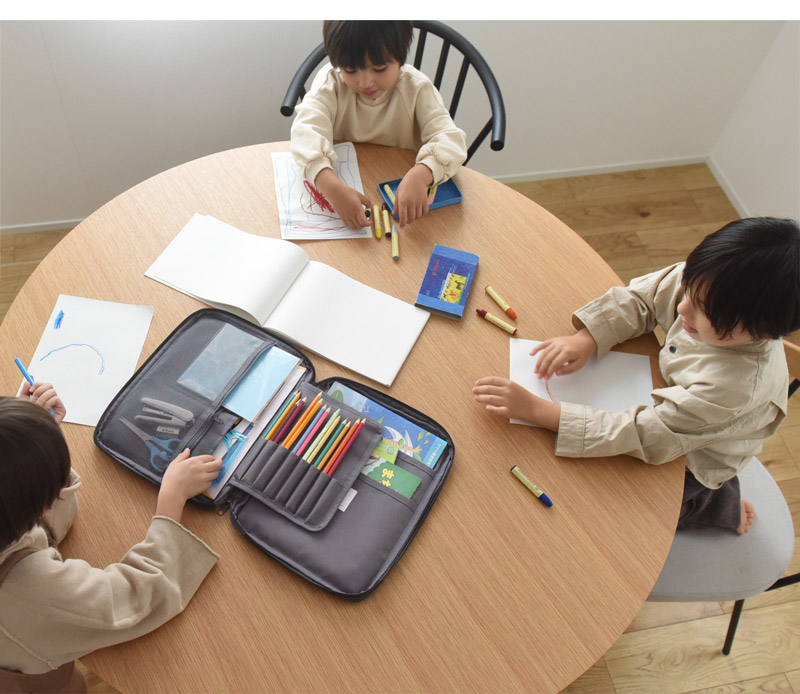 こちらのお絵かきバッグは、お道具箱のような収納力だけでなく、整頓しやすいのが特徴。持ち物の住所を決められるように7個のポケットが付いているので、子どもでも出し入れしやすく、中のごちゃつきを防ぎます。開閉時に飛び出しを防ぐファスナーポケット付きなのもポイント。