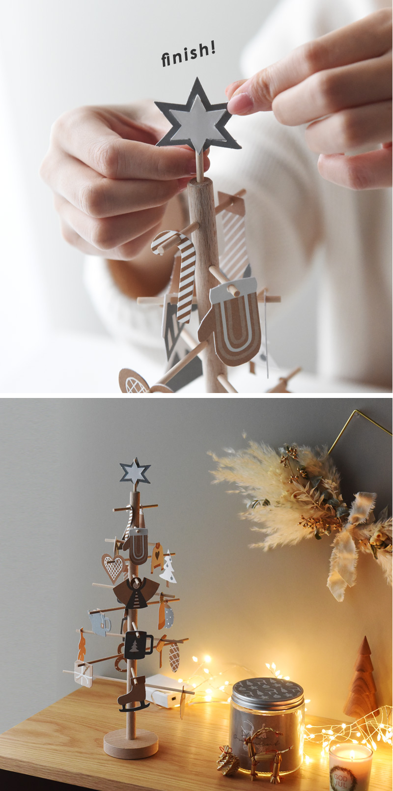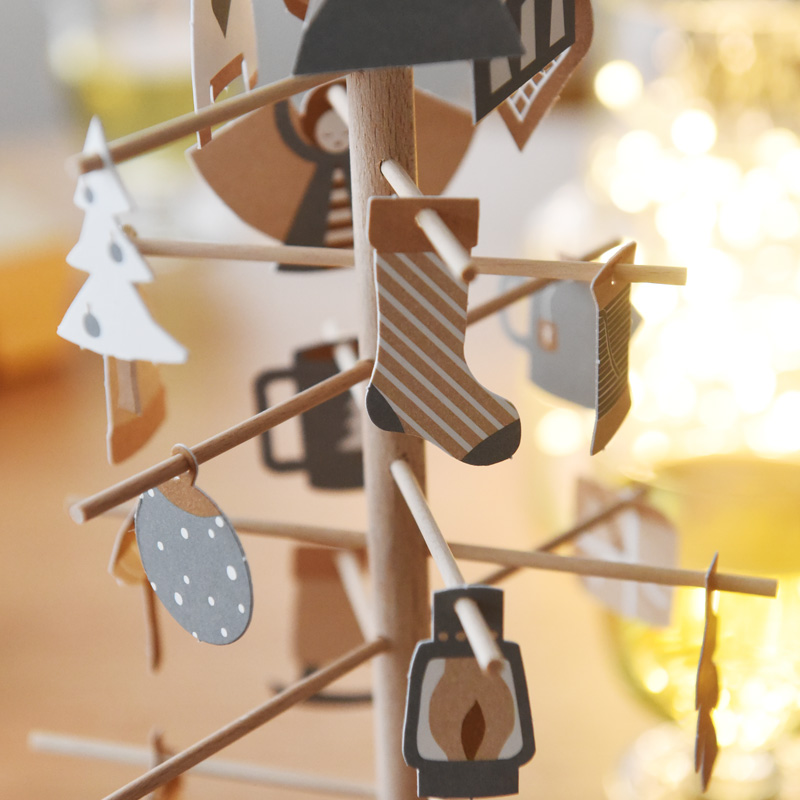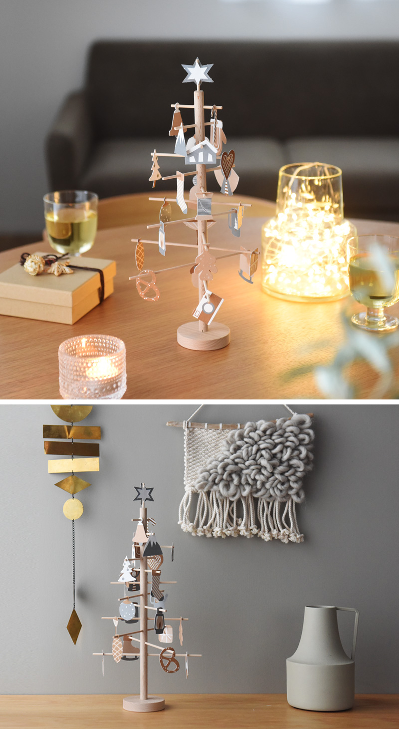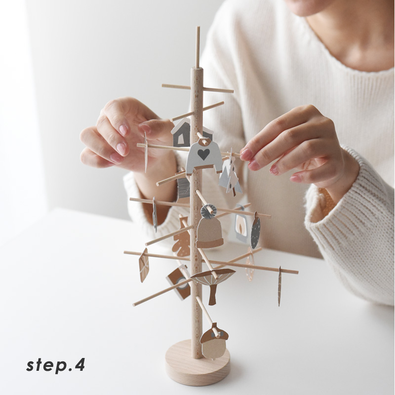ナチュラルな印象のブナ材のツリーに、24のオーナメントを毎日ひとつずつ掛けていくことで、クリスマスにツリーが完成。今日はどのオーナメントにしようかな?どの枝に飾ろう?そんな風に選ぶ時間も楽しい瞬間に。