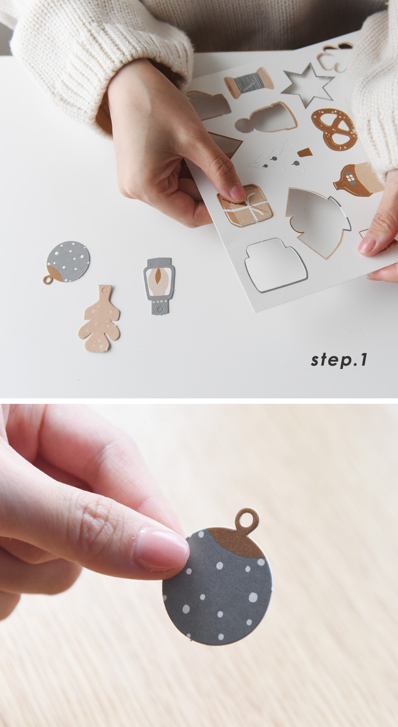 12月1日から、毎日ツリーに掛けるオーナメントをひとつ選んで飾っていきます。ツリーの枝のお好きな位置に、オーナメントの穴を通せばOK。