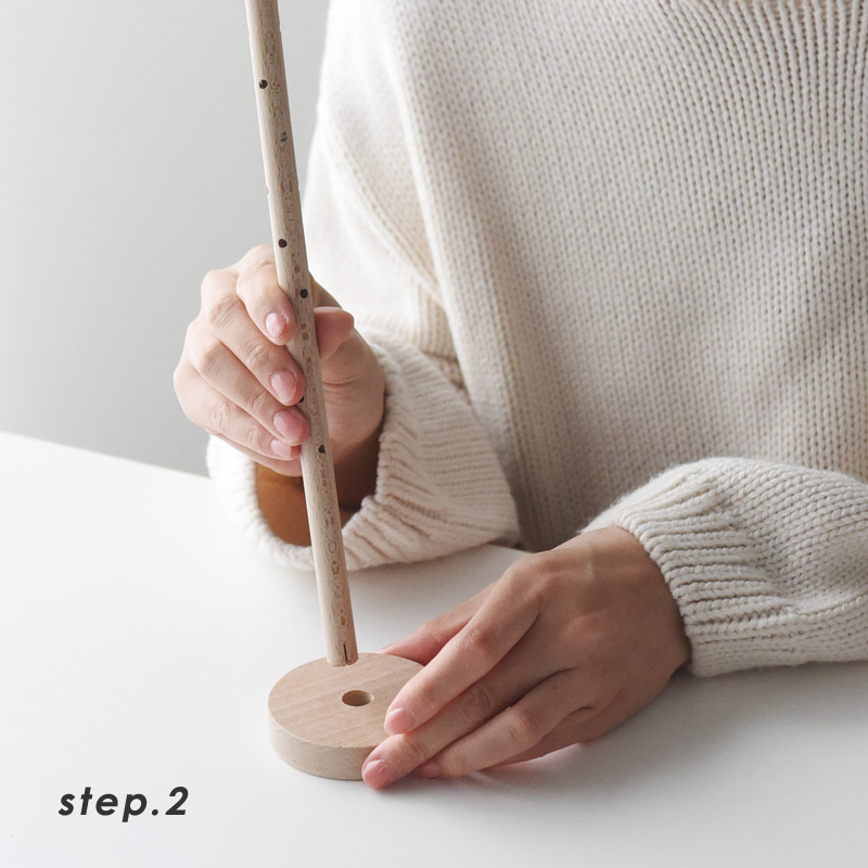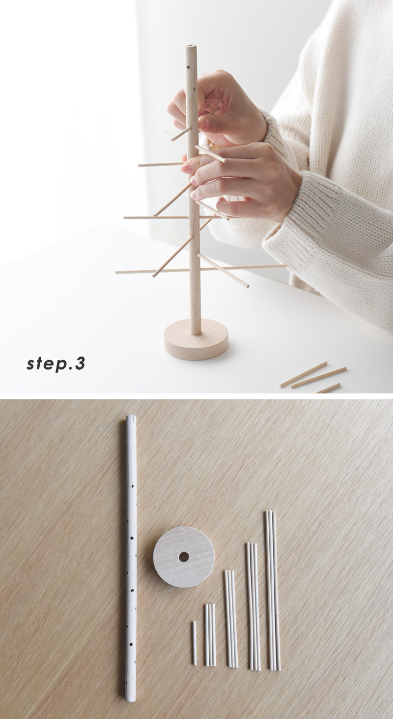 枝パーツを、幹パーツの穴に通します。13本の枝パーツは長さが5種類あり、上に行くほど短くなるようにします。