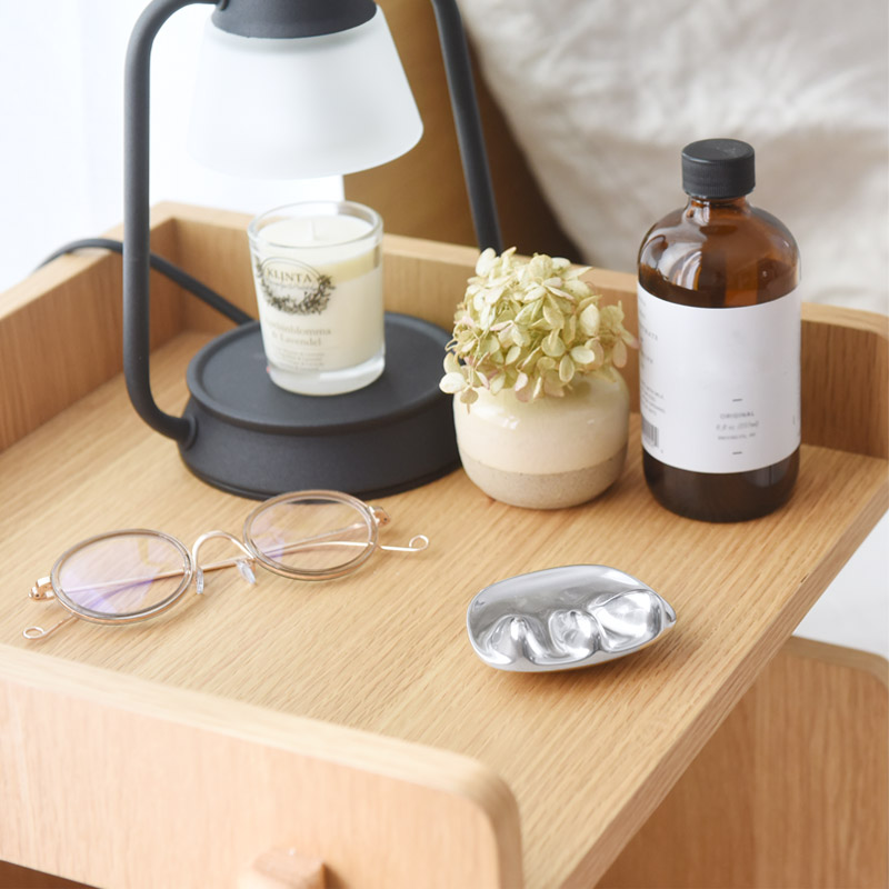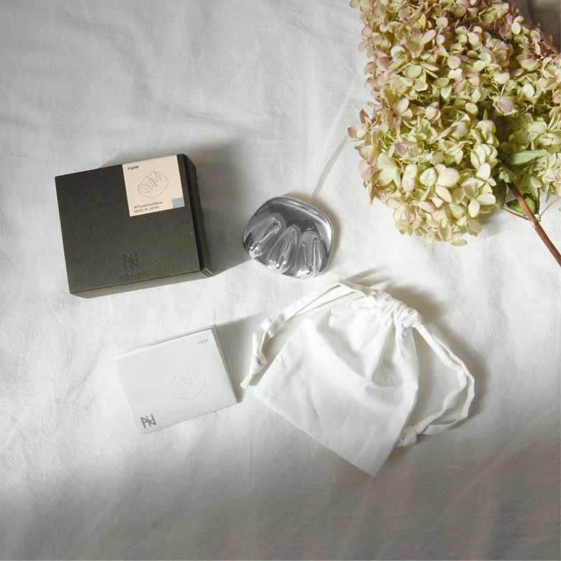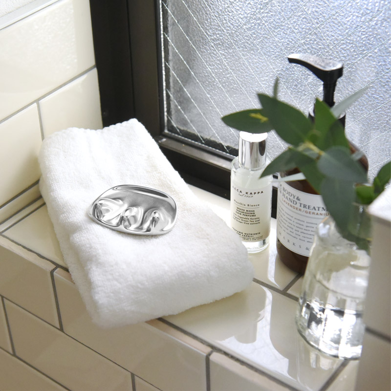 耐食性の高い種類のアルミ製で、オイルを使ったり、お風呂でバスタブにつかりながらリフレッシュ。流れるようなフォルムとミラーのような光沢感は、まるで美しいオブジェのよう。お家のインテリアを邪魔することなく、いつも身近に置いておけます。