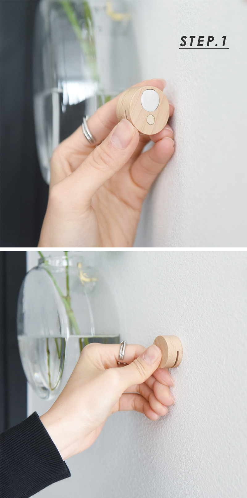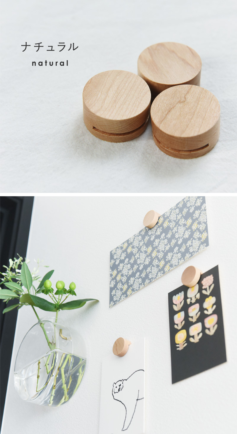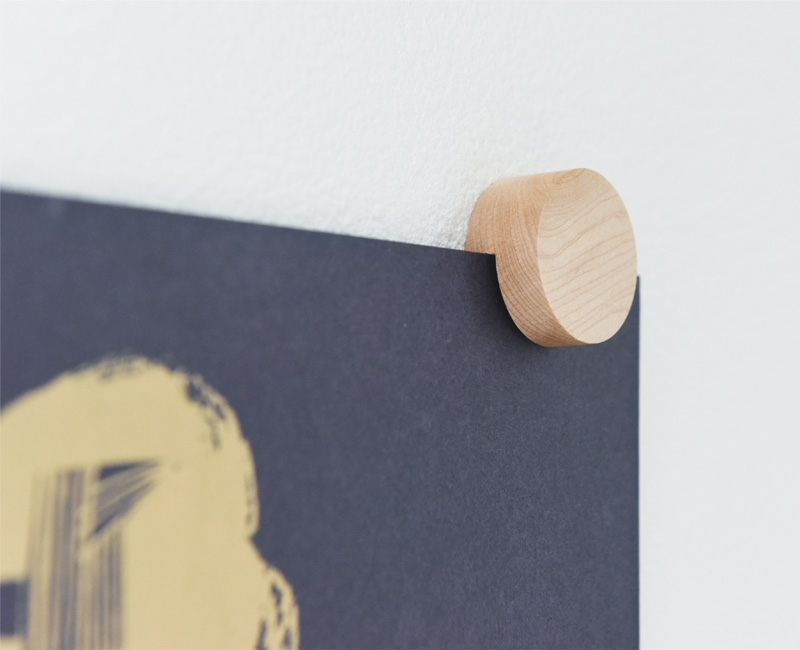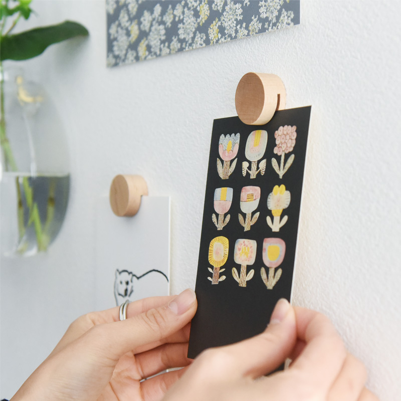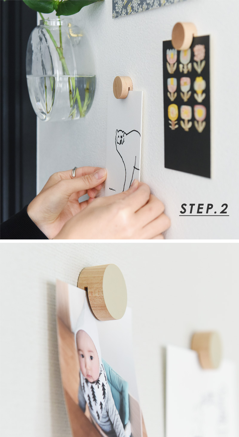 付属の粘着ゴムで壁にクリップを貼り付け、クリップのスリットに写真やポストカードを差し込むだけ。壁に穴を開けないだけでなく、木のクリップがインテリアに映えるのもポイントです。