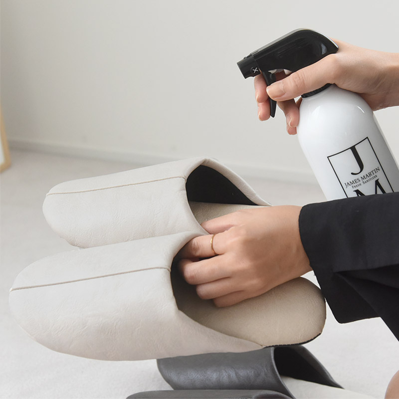 また、来客用スリッパとしても、使用前後にシュッとスプレー&拭き取りで除菌OK。いつもキレイに保てるのが嬉しいスリッパです。