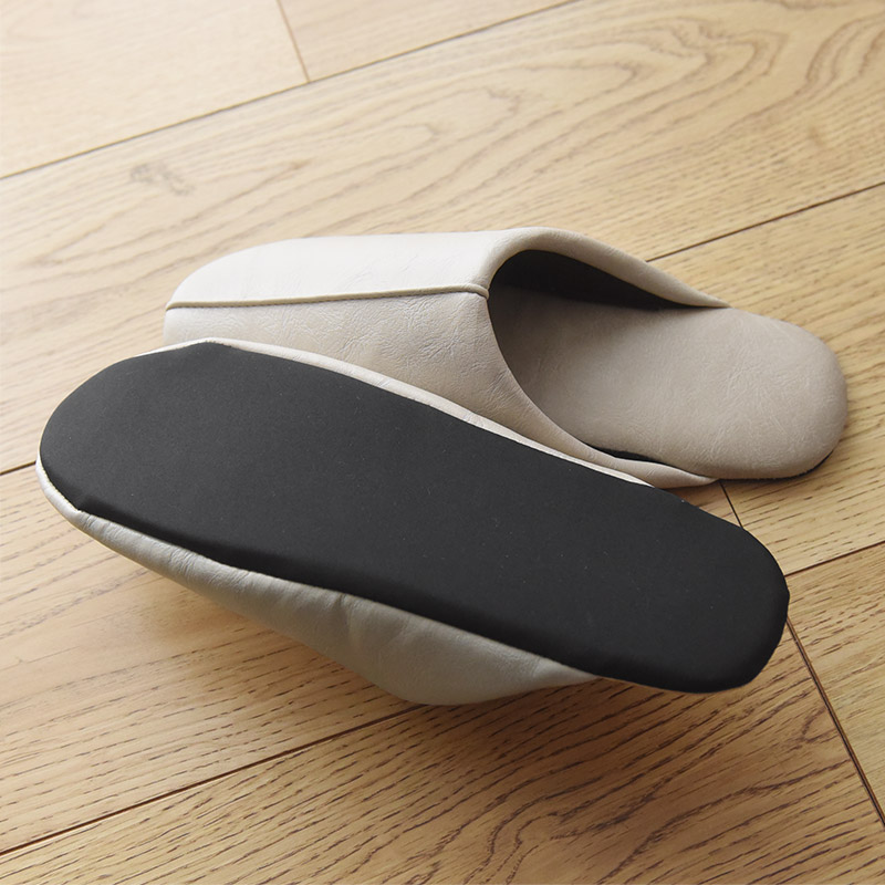 アッパー、インソール、底面のすべてに、アルコールでの拭き取り消毒ができるPVCレザーを使用。気軽にアルコール除菌ができて、いつも清潔をキープできるスリッパです。