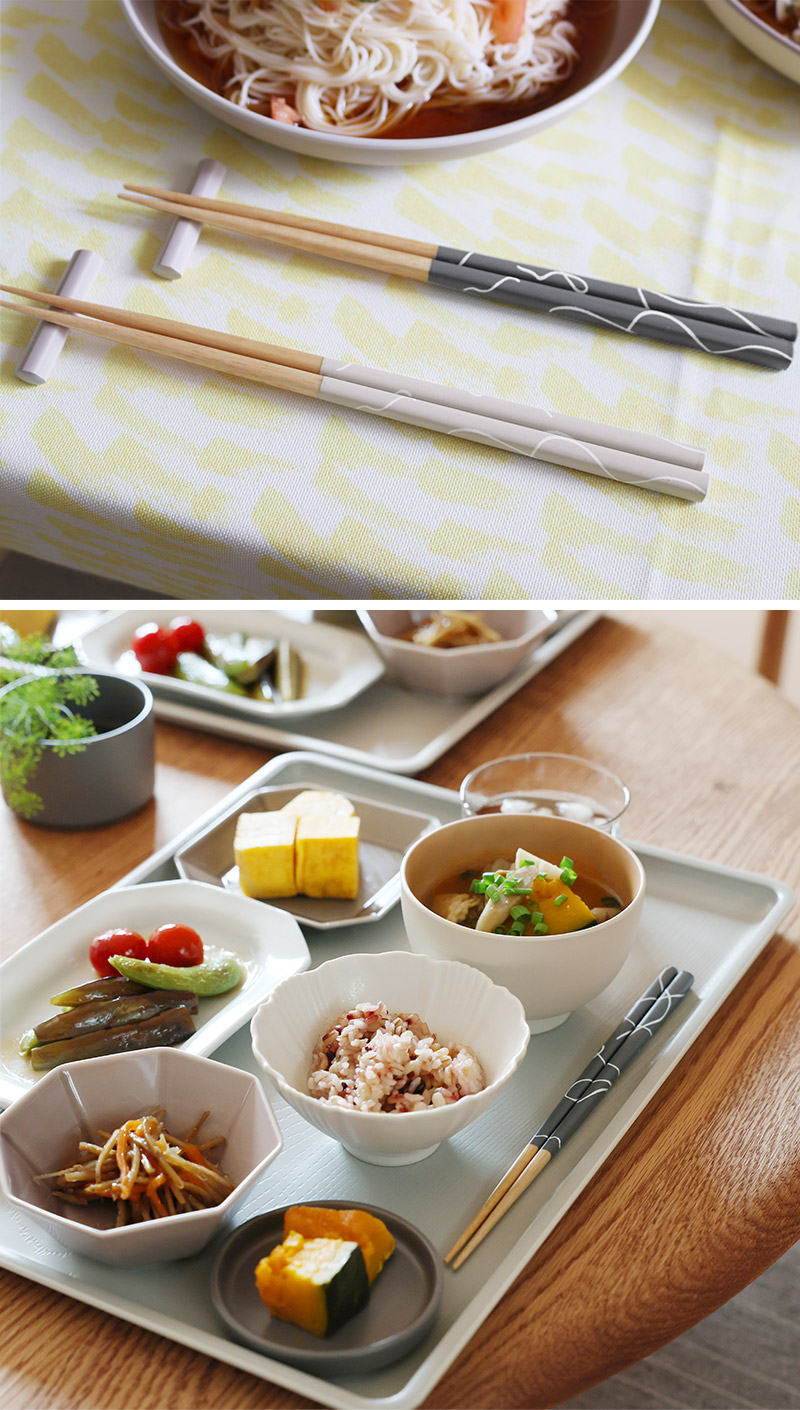 ゆるやかに描かれる華奢なラインは、食卓のさりげないアクセントに。四角箸のベースカラーを合わせているので、無地の箸とも相性バッチリです。