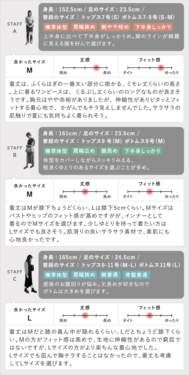 合わせやすく安心感のある丈感着丈は101~103cm(M~L)の、短すぎず、長すぎない安心感のある長さ。長めのワンピースともバランス良く着られて、合わせやすい長さです。