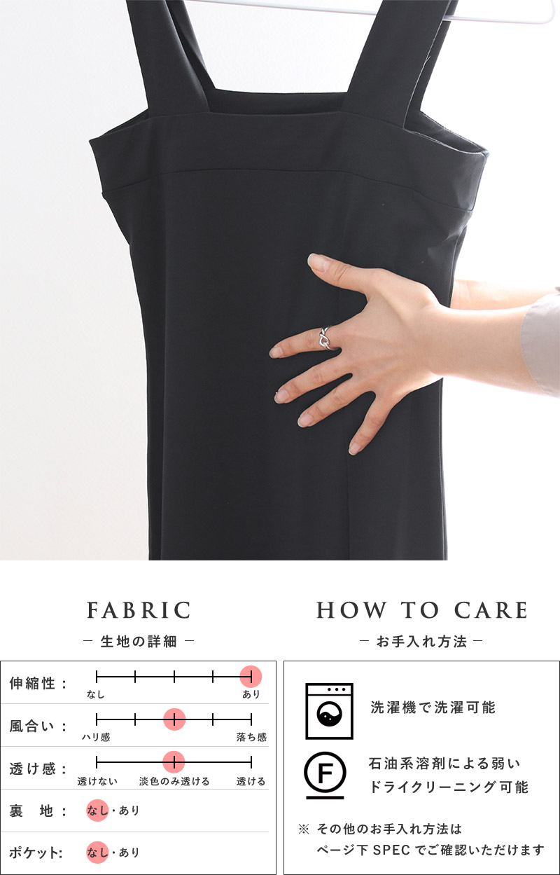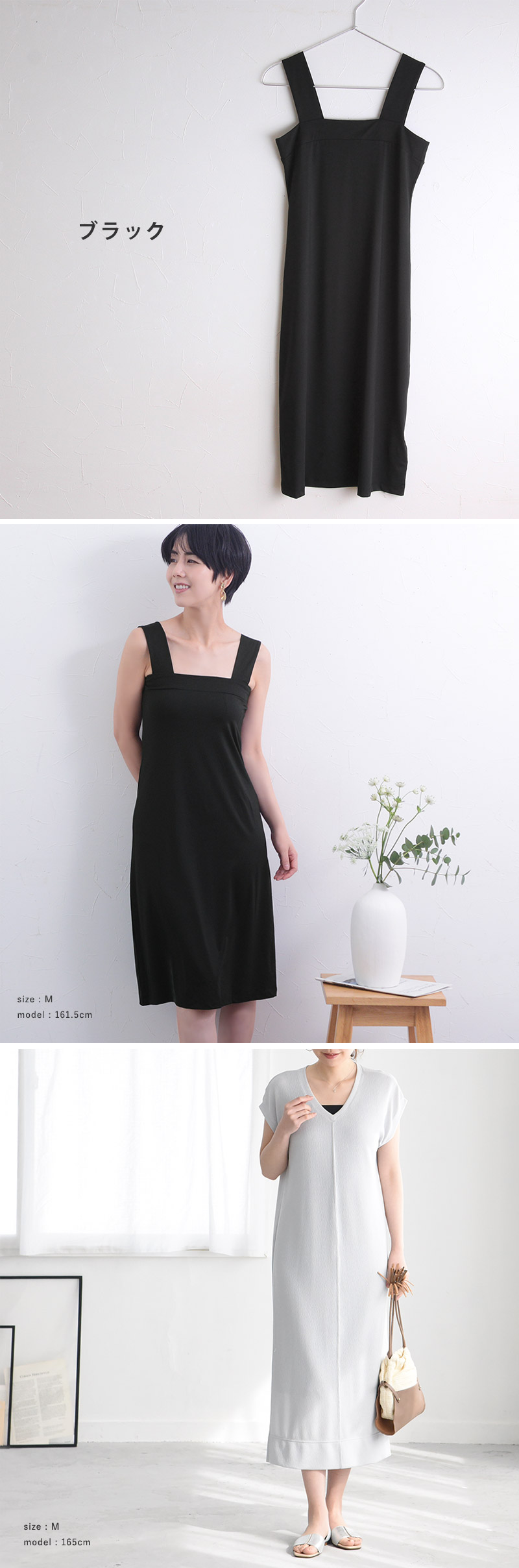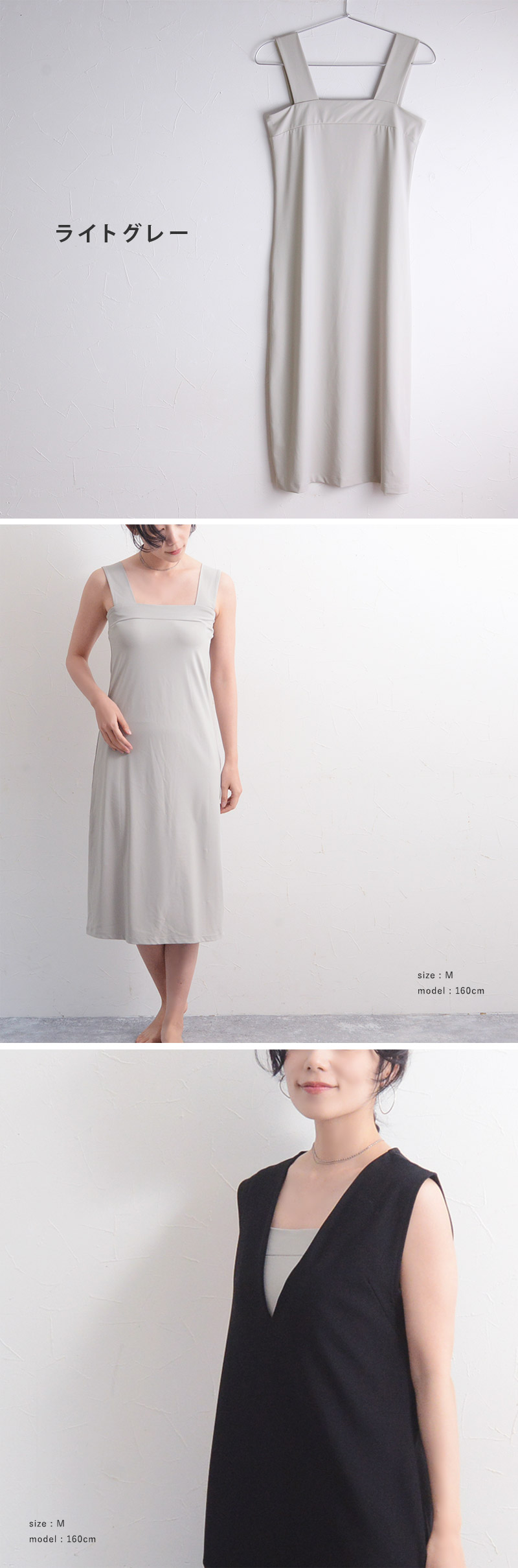 ワンピースタイプの胸元はスクエアタンクと同じ、すっきりとした直線デザイン。Vネックのワンピースと合わせて、レイヤードも楽しめます。軽やかな春夏の装いの下に、1枚着たいお守りワンピースです。