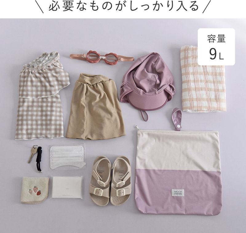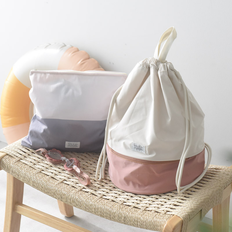 両面撥水加工を施したポリエステル素材なので、濡れたものを入れてもOK。プールや海水浴にはもちろん、シンプルなデザインだから、普段使いもしていただけます。