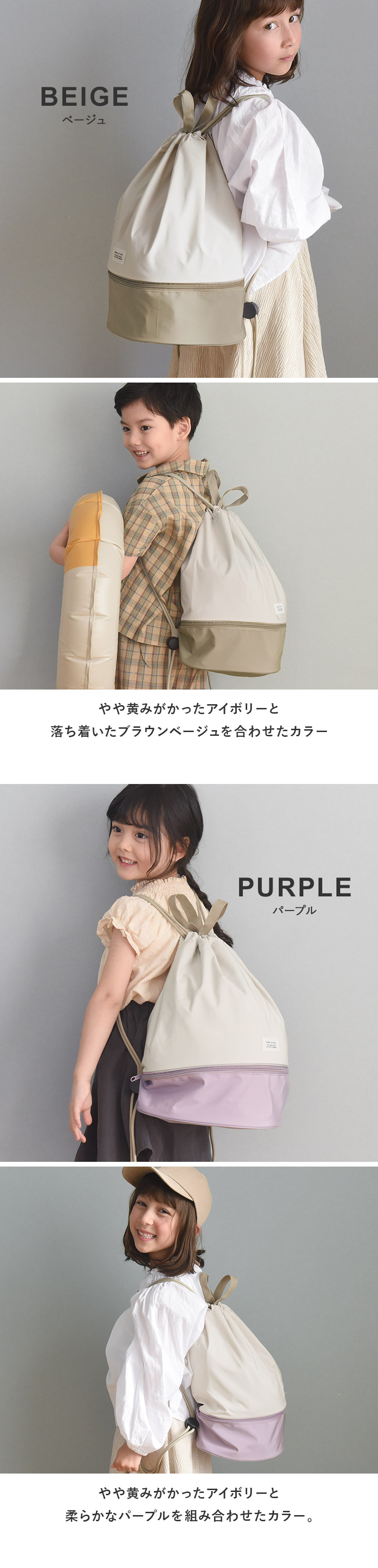 2層式になったナップサック型のプールバッグ。お子様でも整理しやすく、濡れた物も収納可能。シンプルデザインなので、プールや海水浴、水泳教室だけでなく、普段使いもできます。