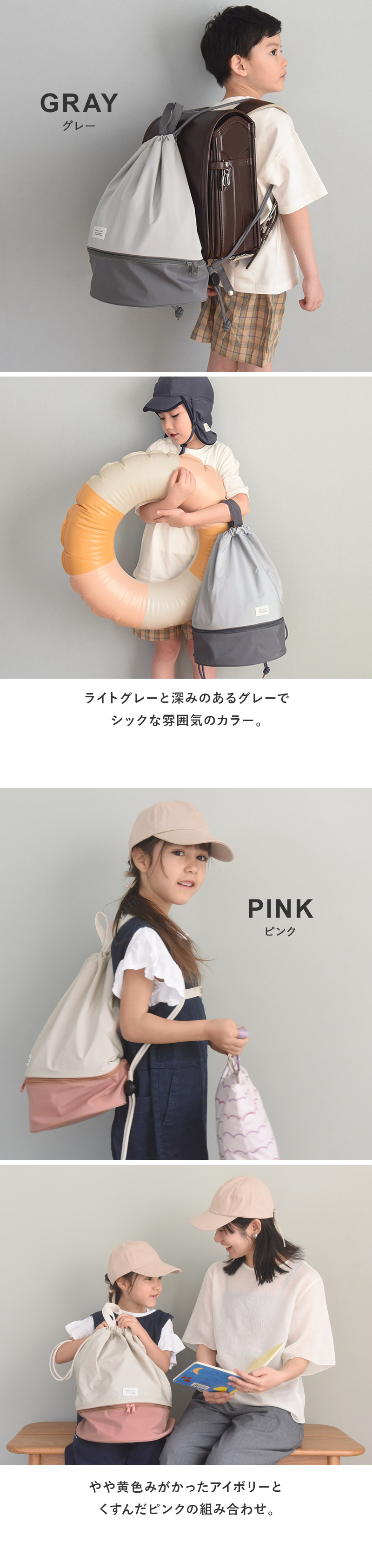 • まずやっぱり色味が可愛いです♪このシリーズが好きすぎて息子の持ち物がグレーばっかになってきました。基本持ち物は手提げタイプで持ちたい息子でなおかつ1年生はランドセルの上にナップサック型にするのが禁止のようなので、手持ちタイプと迷いましたが、雨の日も水泳グッズは持っていかないといけないようでランドセルには絶対に入らないしいずれ背負うようになるかなとこちらのタイプを購入。