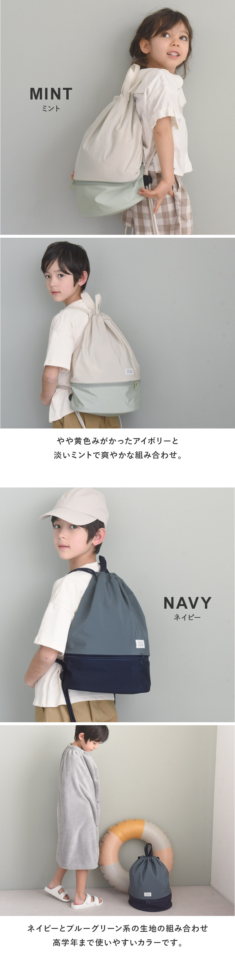 シンプル&大人かわいいデザインのナップサックタイプのプールバッグ。キッズはもちろん、ママが代わりに持ってもサマになるデザインです。
