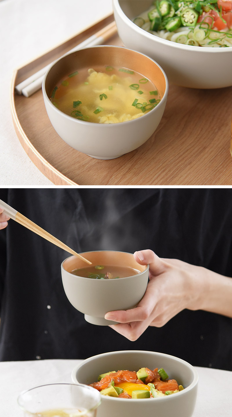 樹脂製の汁椀には「軽い」「割れにくい」「熱くなりにくい」というポイントも。その軽さや持ちやすさに慣れてしまったら、もう木製の重いお椀には戻れません。