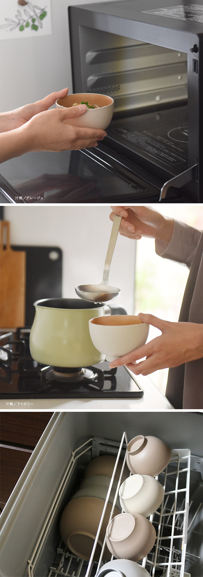 普段使いしやすくて、毎日つい手に取ってしまう。そんな器を目指して作った、bon moment(ボンモマン)の樹脂製汁椀。見た目も大切にしながら、使い勝手にまずこだわり、「電子レンジ・食洗器対応」を叶えました。