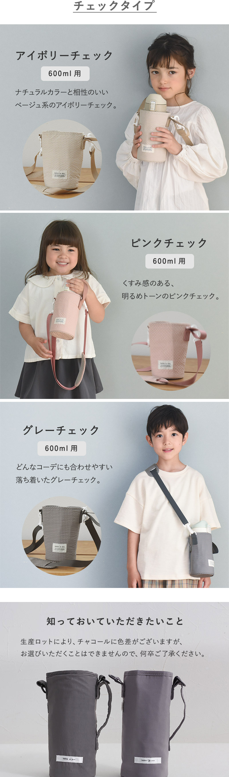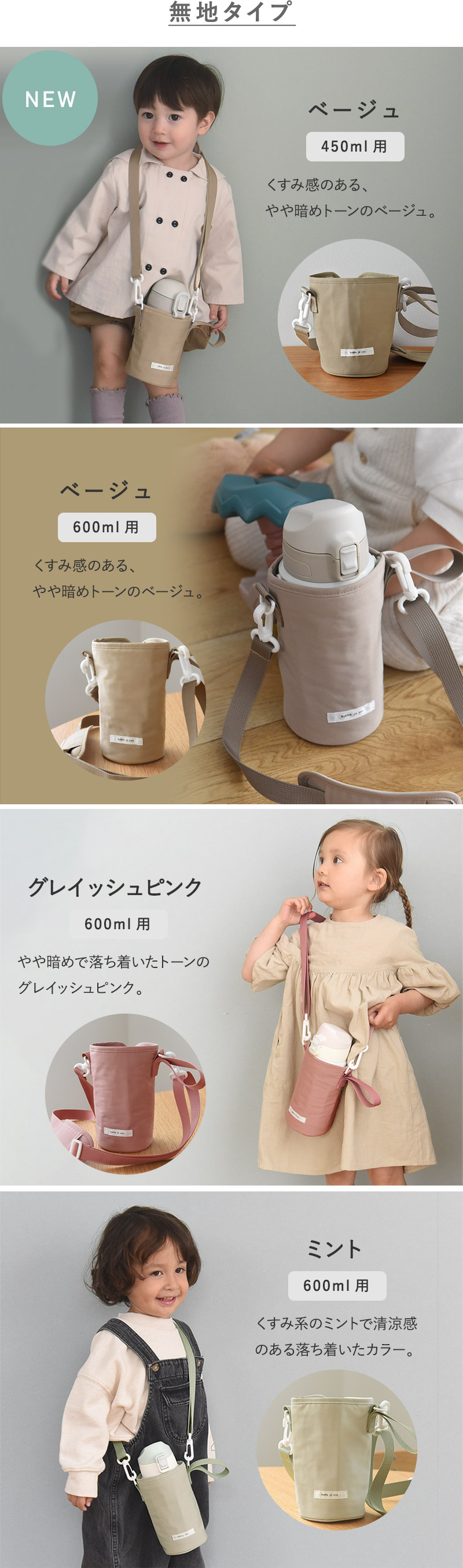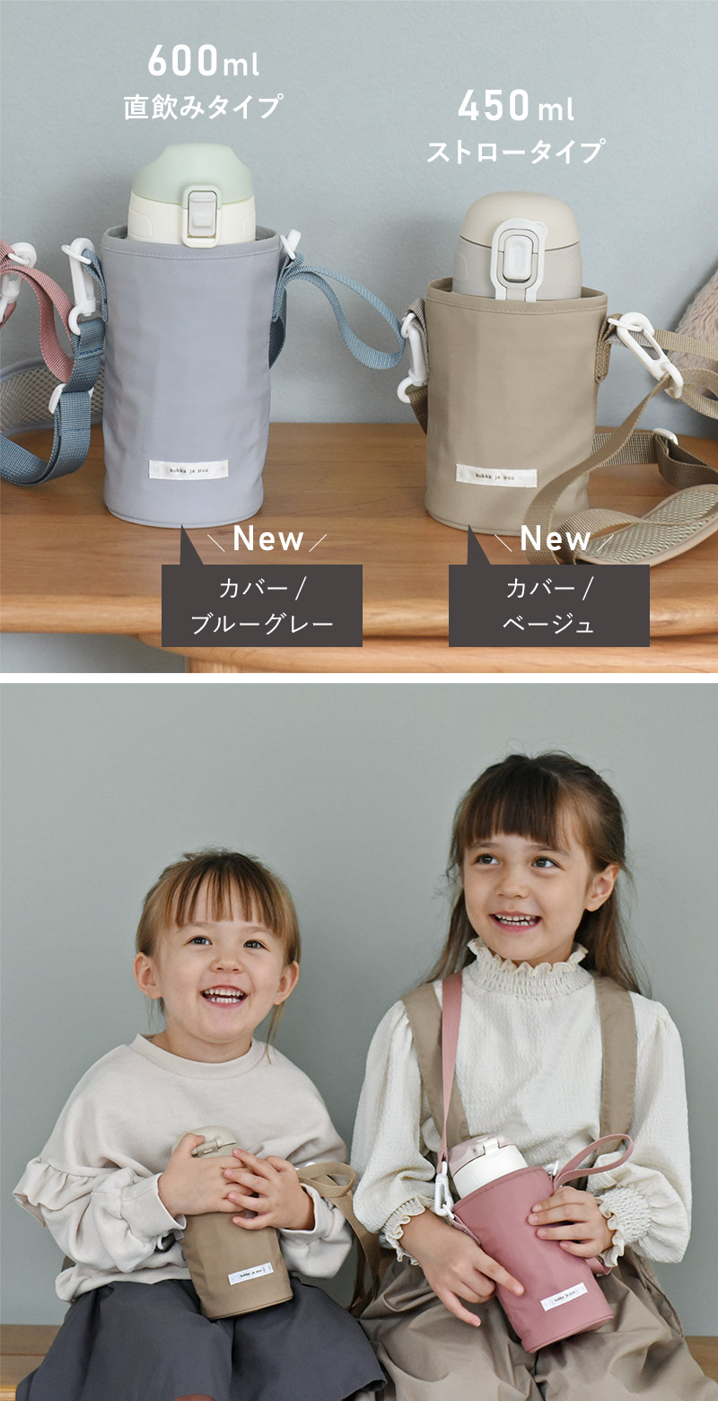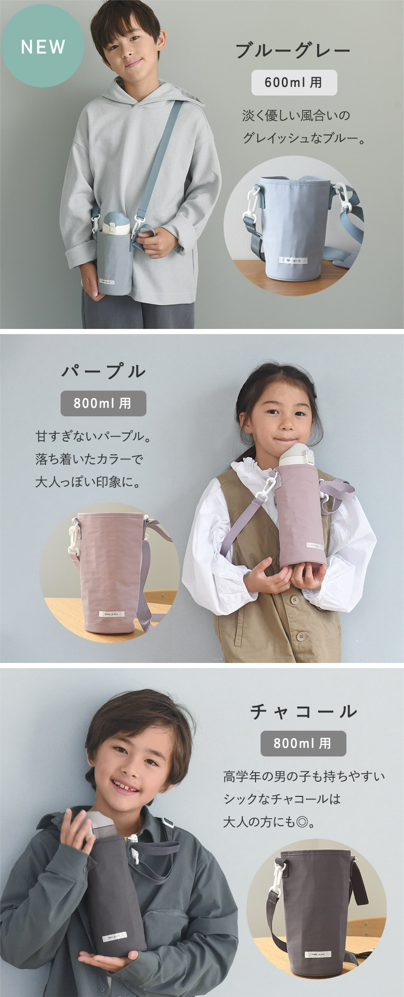 600ml用のカバーに“ブルーグレー”が登場。さらに、450mlの水筒カバーも仲間入り。どちらも優しいニュアンスカラーで長く使いやすいデザインです。