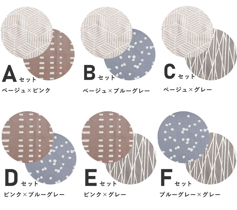 やさしいカラーに、白い柄が爽やかな印象。お好きなデザインを2枚組み合わせた全6パターンからお選びいただけます。北欧テイストなライン柄、モダンなジオメトリック柄に、チェック柄とドット柄が追加。