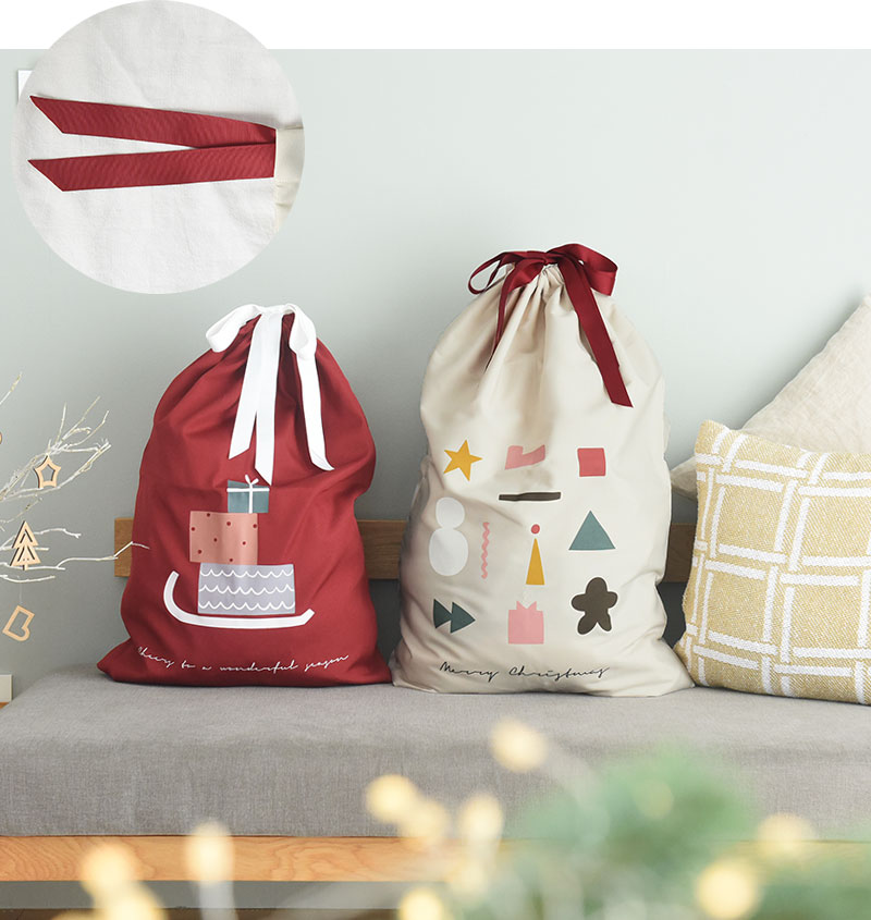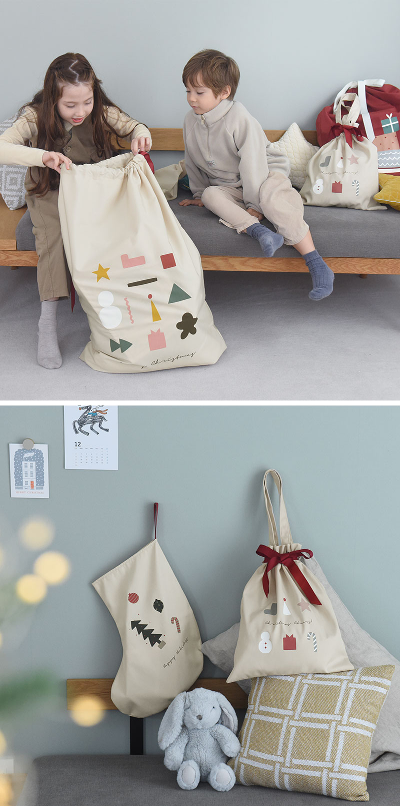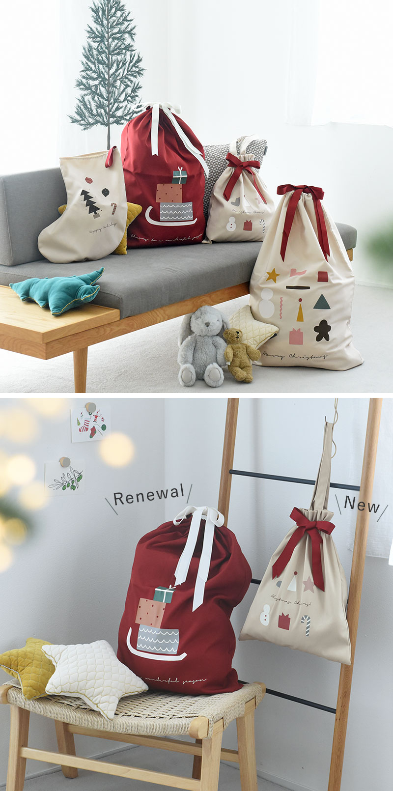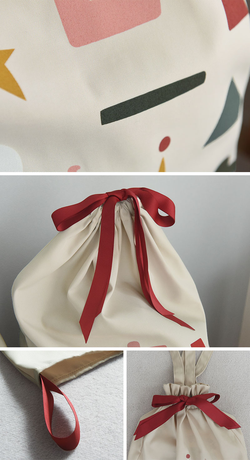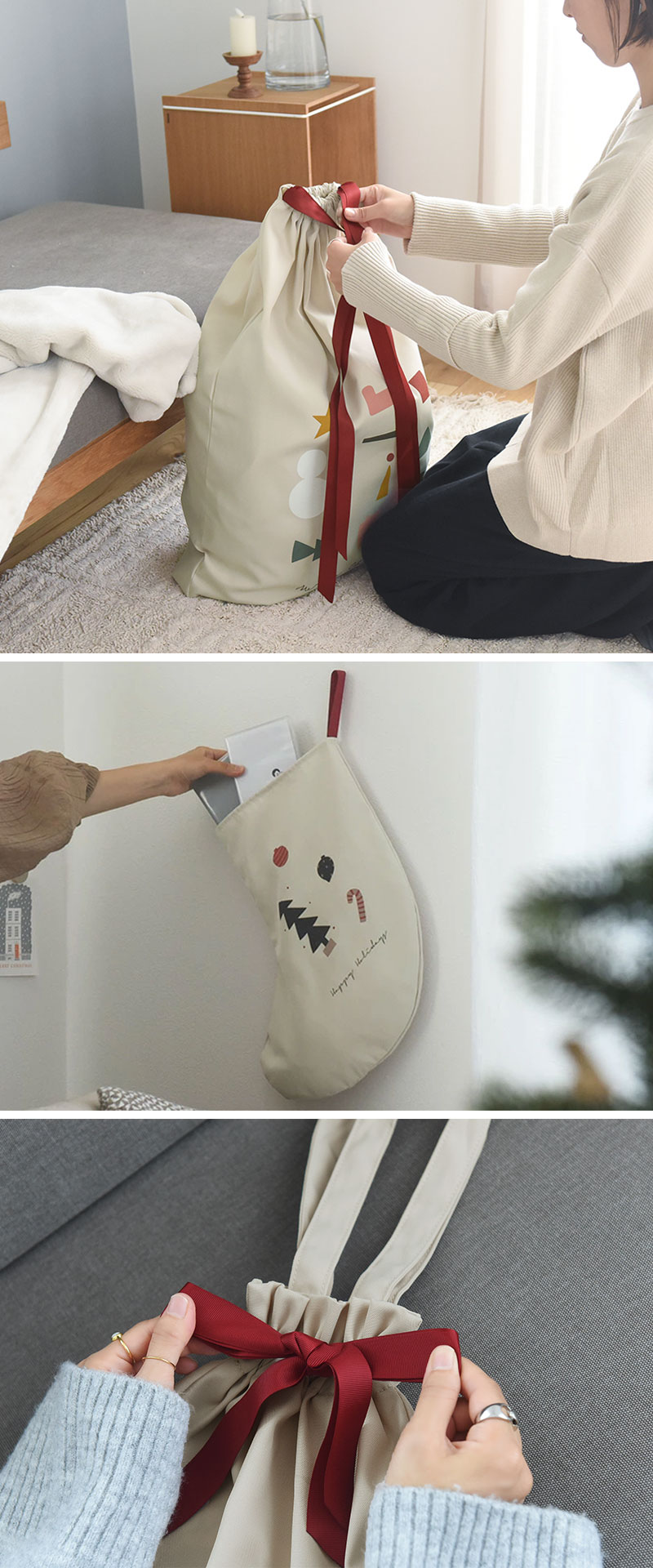 こちらは、袋に入れてリボンを結ぶだけで、特別感のあるラッピングが完成します。靴下タイプはプレゼントを入れてひょいっと吊るすだけでさらに簡単。トートバッグもリボンを絞るだけでOK、バッグのままでも◎です。