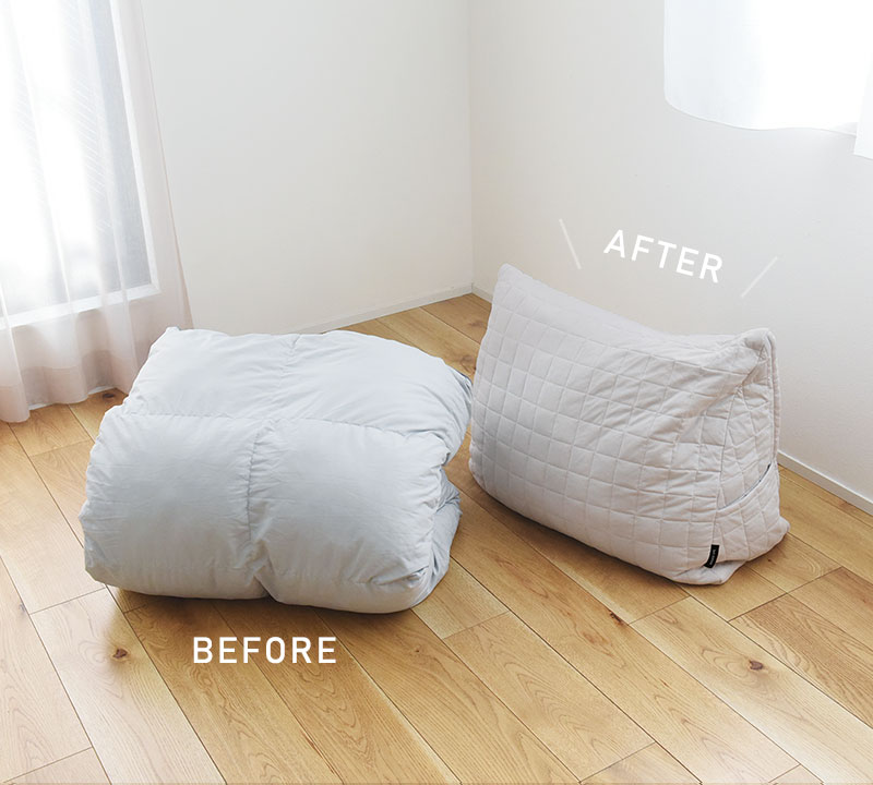 冬物の寝具や、出番の少ない来客用の布団セット。布団収納カバーに、たたんでまるめて入れるだけで、ふっかふかのクッションに早変わりします。